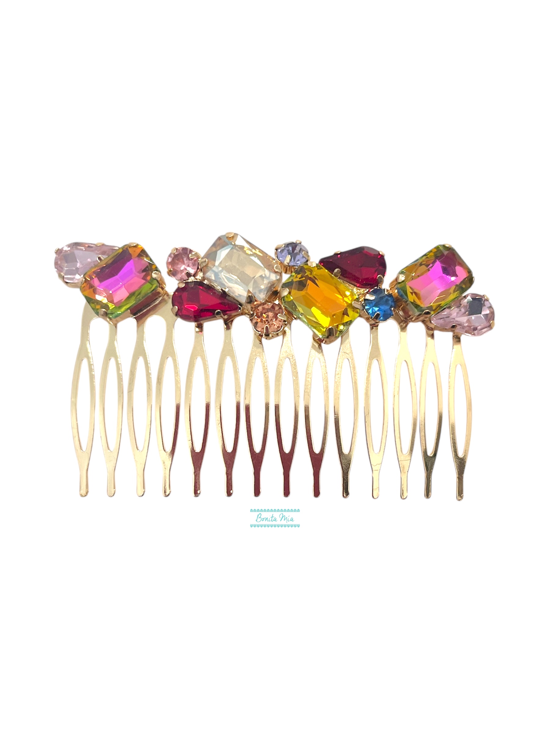 Peinecillo de metal dorado con cristales multicolor (rojo, amarillo, lila, rosa…)
