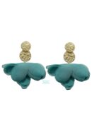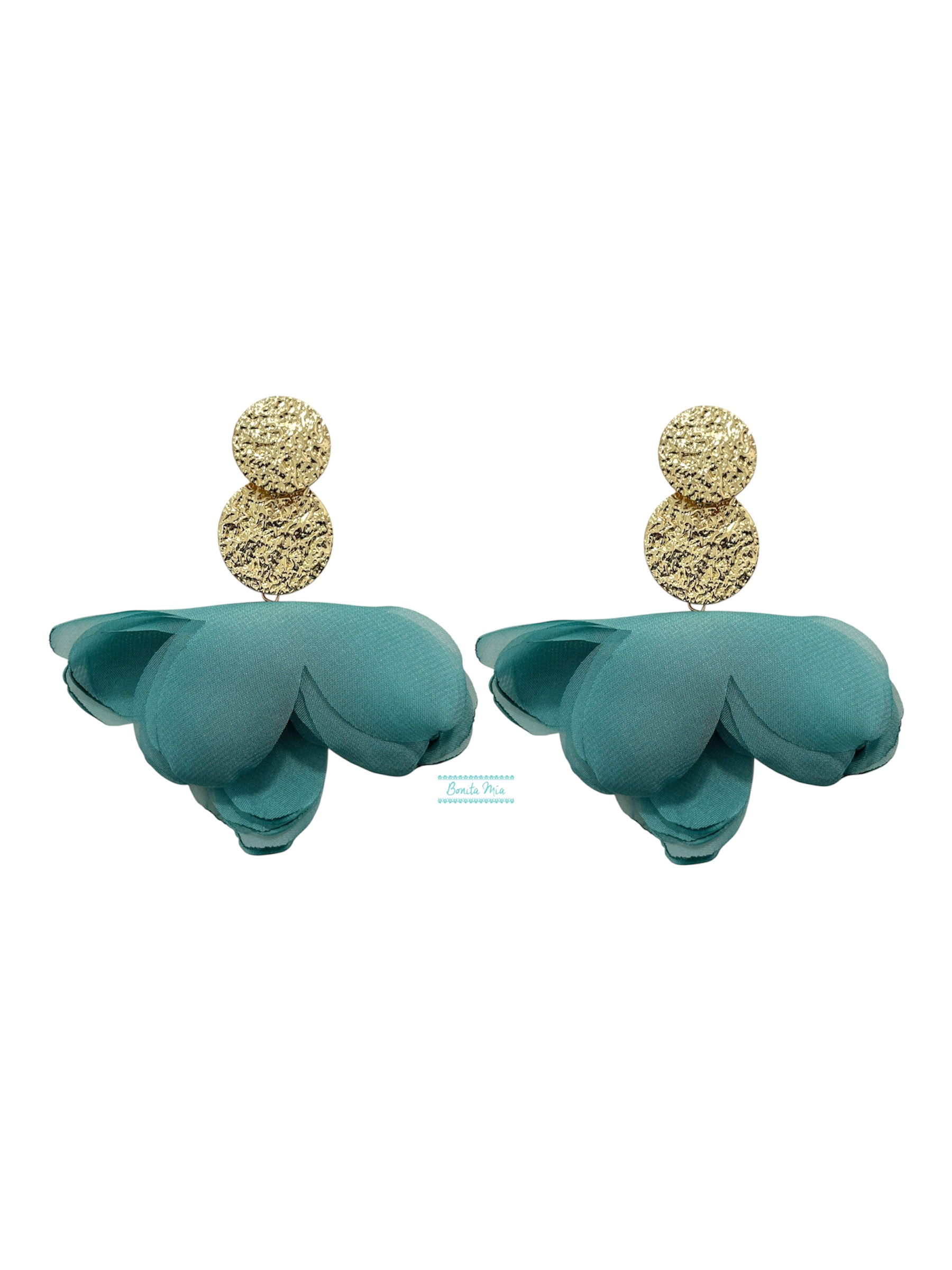 Pendientes dorados circulares con tul en forma de media flor agua.