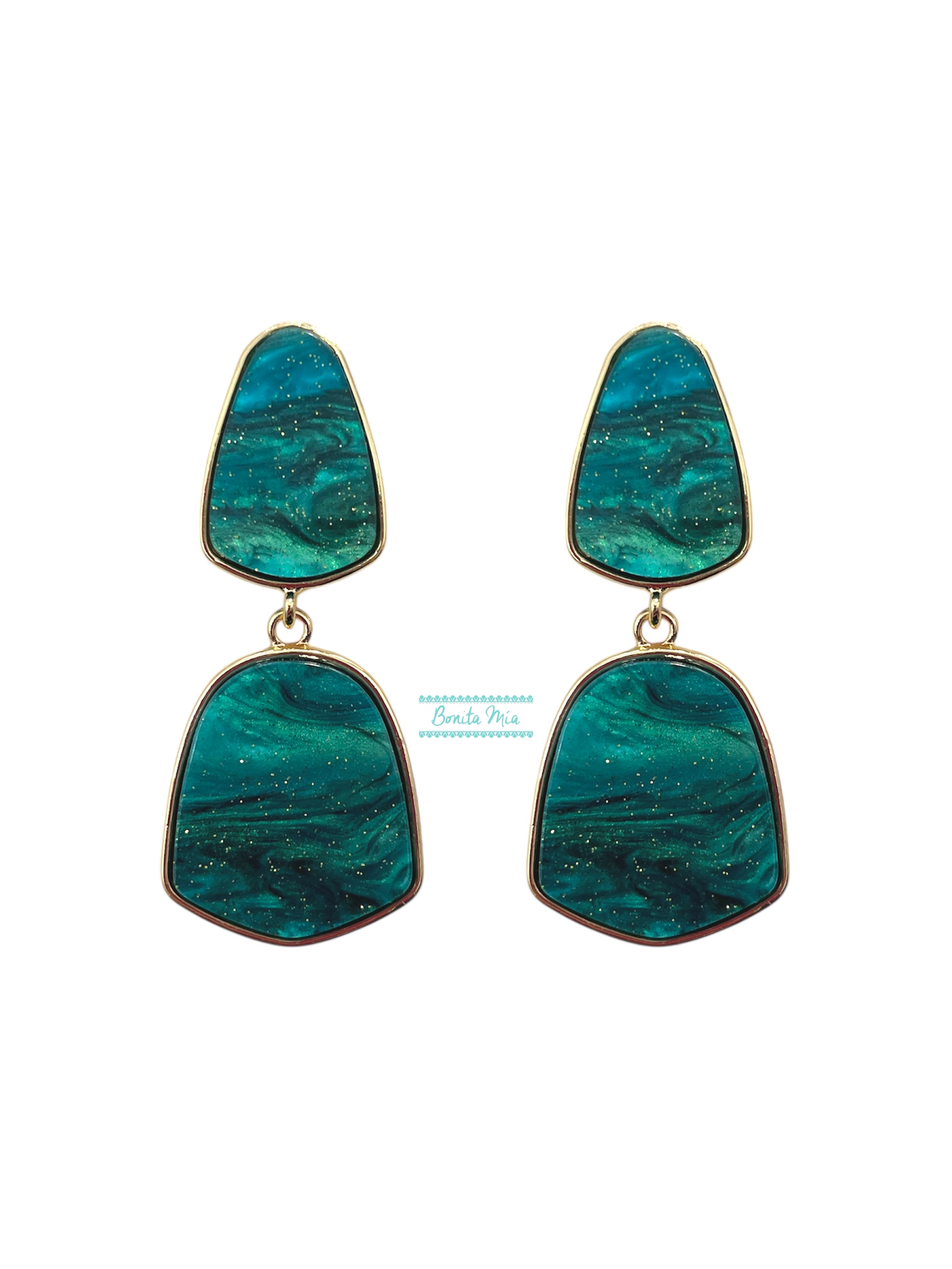 Pendientes verde esmeralda nacarados con brillo y engarces dorados. Tipo de cierre: presión.