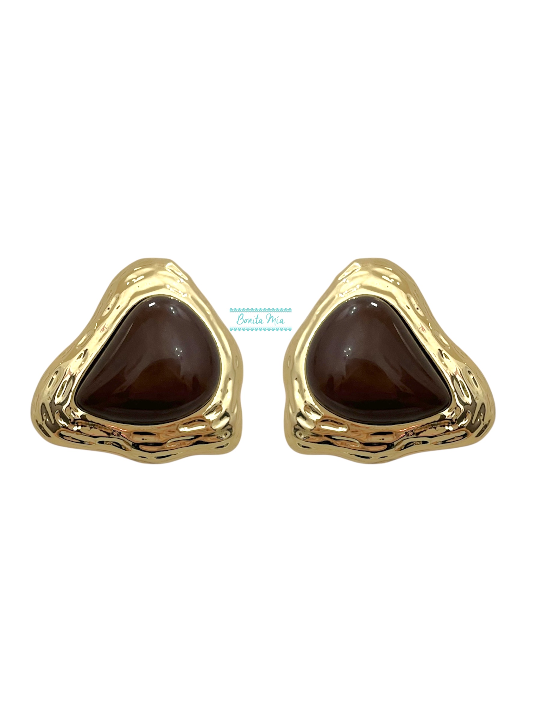 Pendientes dorados con textura y detalle de gota chocolate.