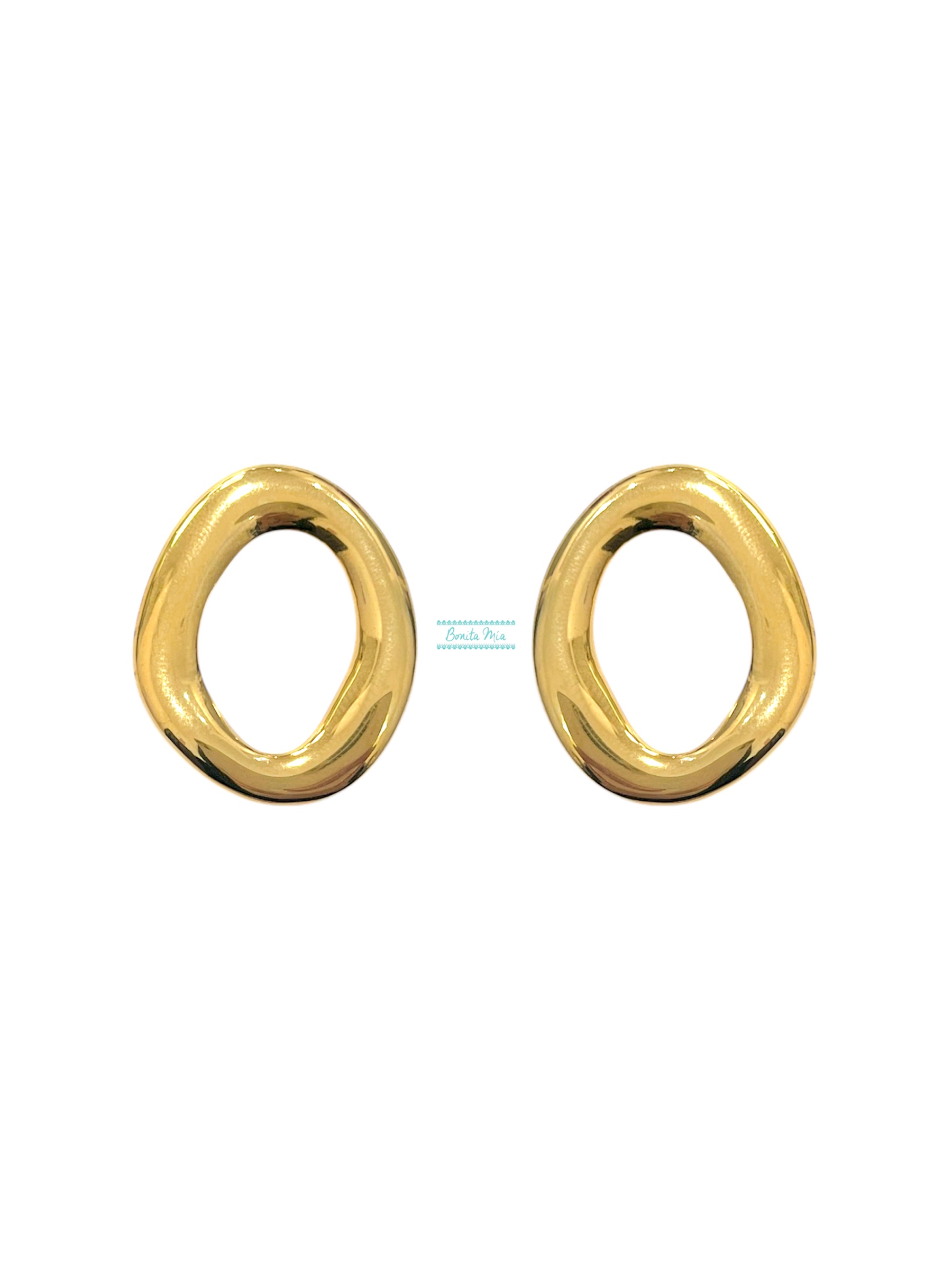 Pendientes dorados con forma ovalada irregular planos. Peso muy ligero. Acero inoxidable.