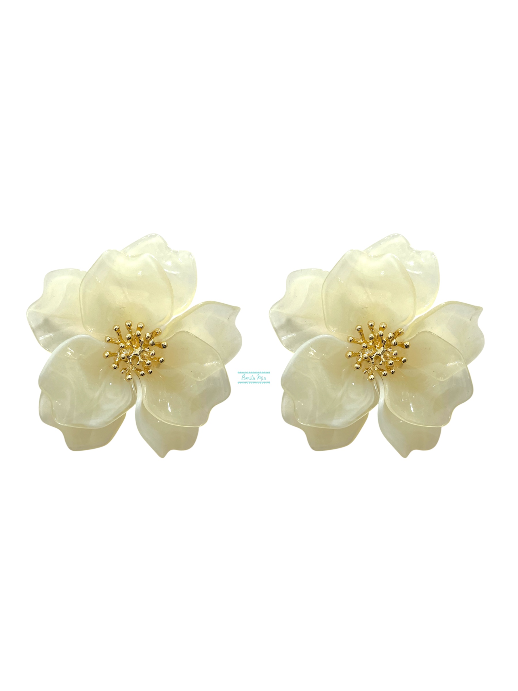 Pendientes de flor beige con detalle de dorado. Material resina, peso ligero.