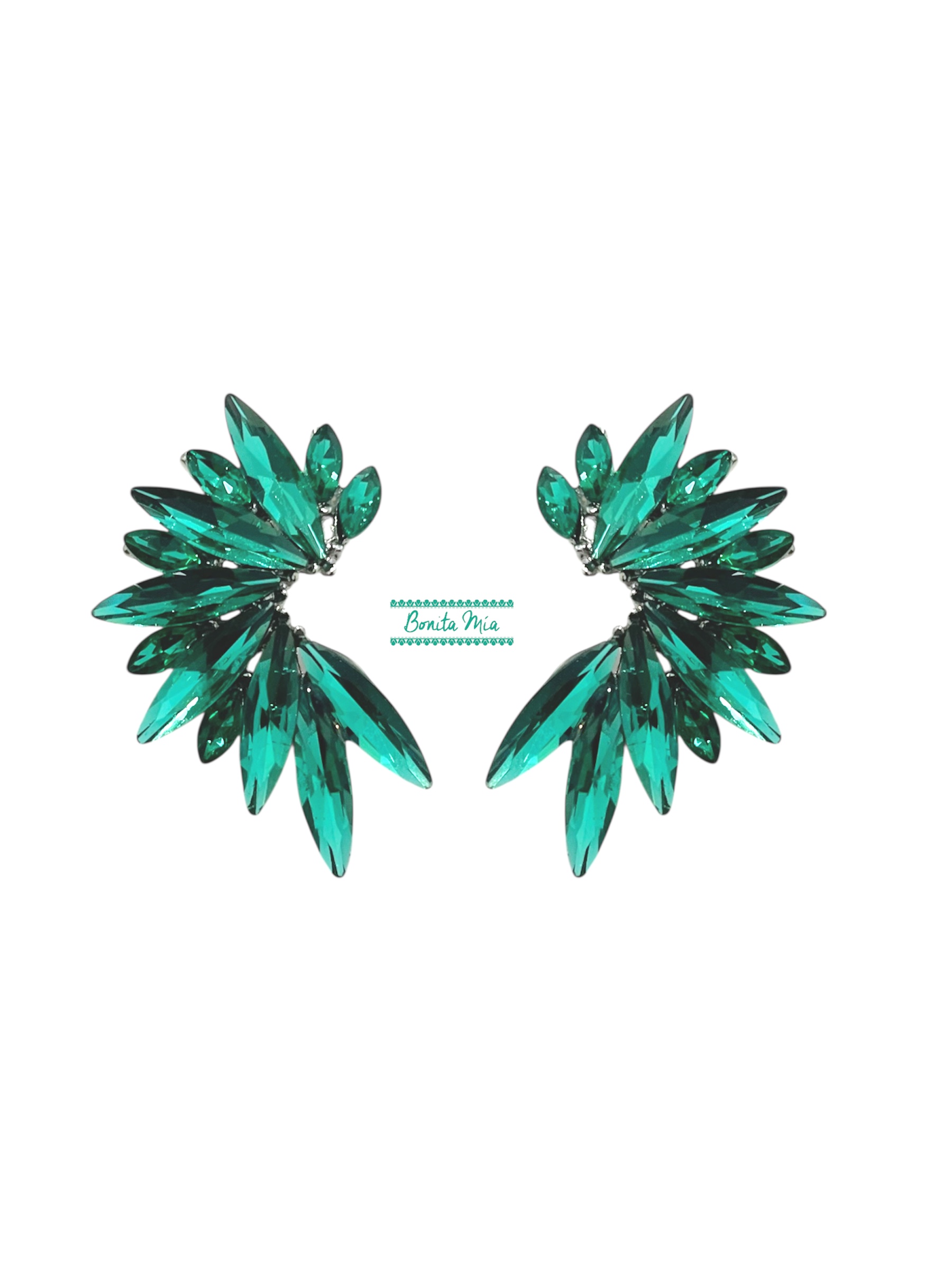 Pendientes con forma de media luna y cristales verde aguamarina y engarces en plata.