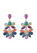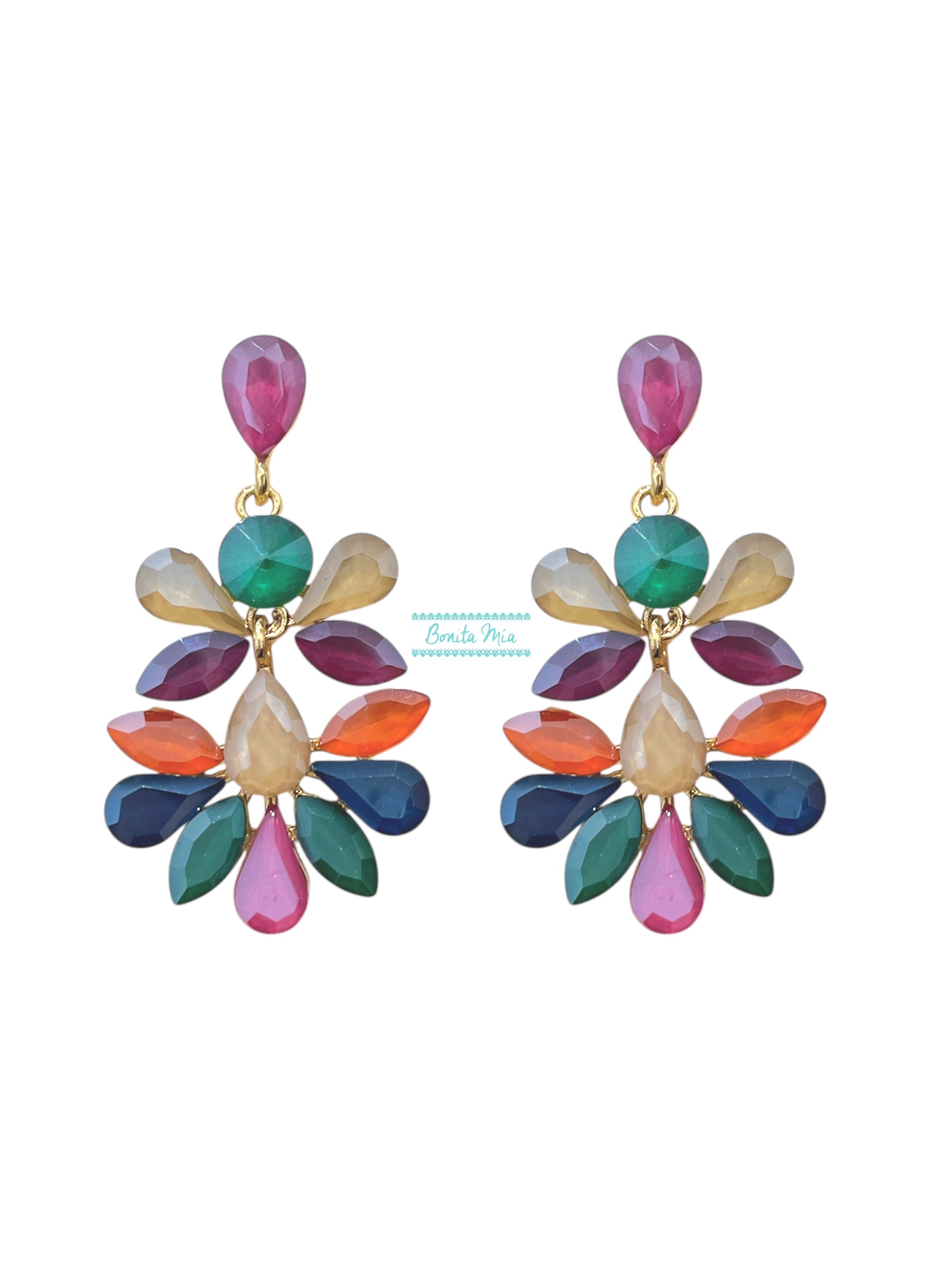 Pendientes en caída de cristales en tono esmeralda, azul marino, naranja, buganvilla, beige…