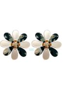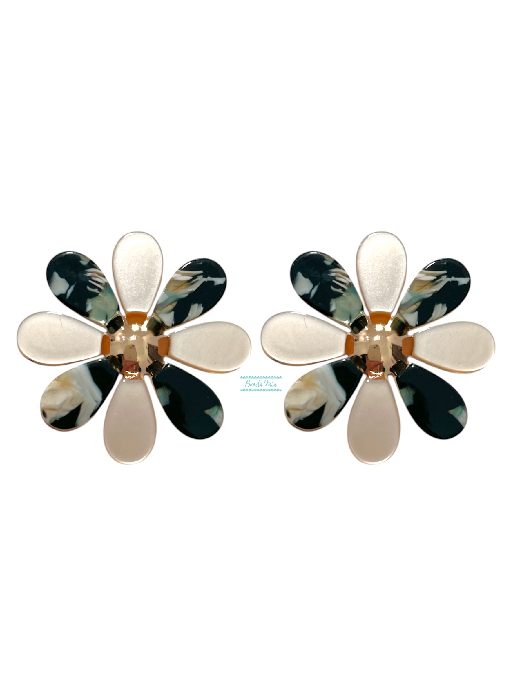Pendientes en forma de flor de nácar en tono beige y negro con centro en dorado.