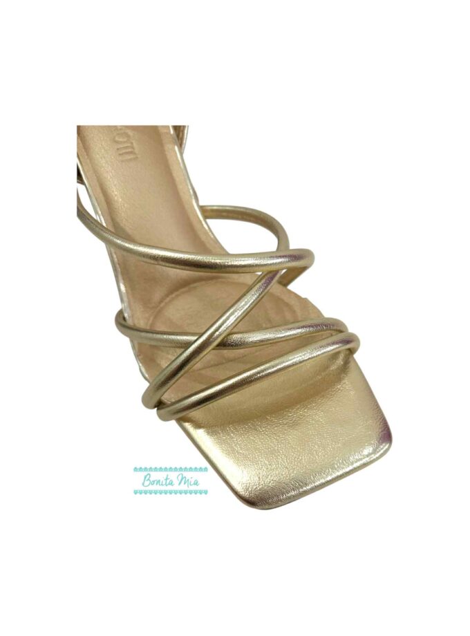 Sandalia en color dorada con detalle de tres tiras cruzadas y pulsera al tobillo. Lleva la plantilla acolchada.
