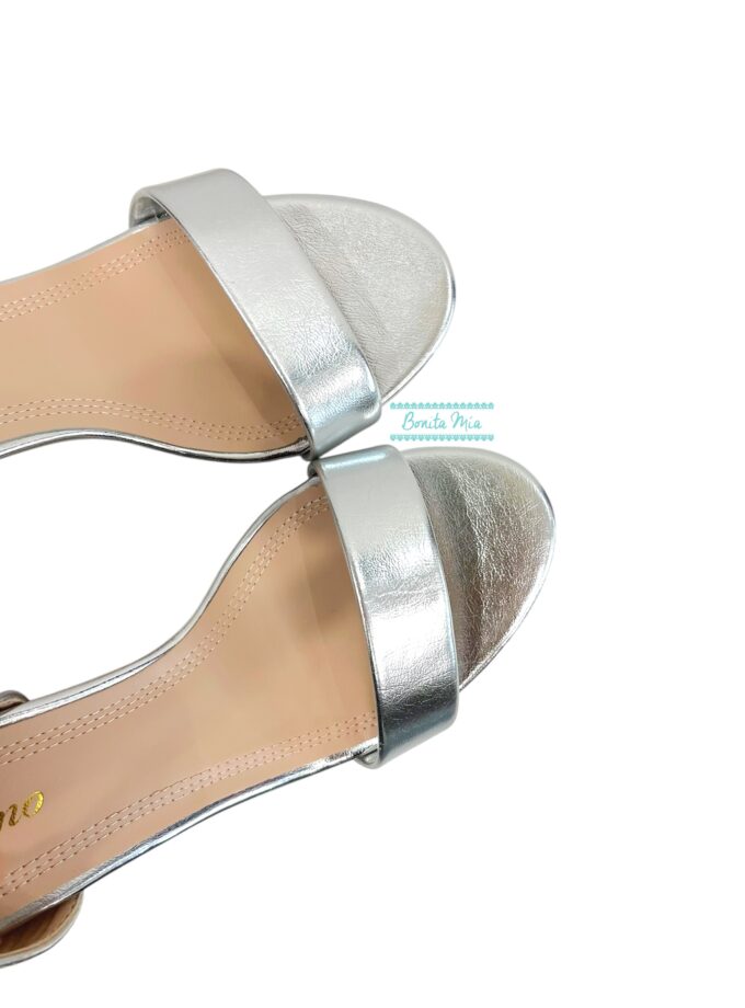 Sandalia metalizada con brillo en plata con pulsera en el tobillo, tacón semi ancho más estable y plataforma delantera.