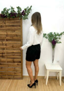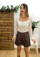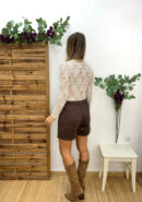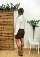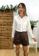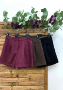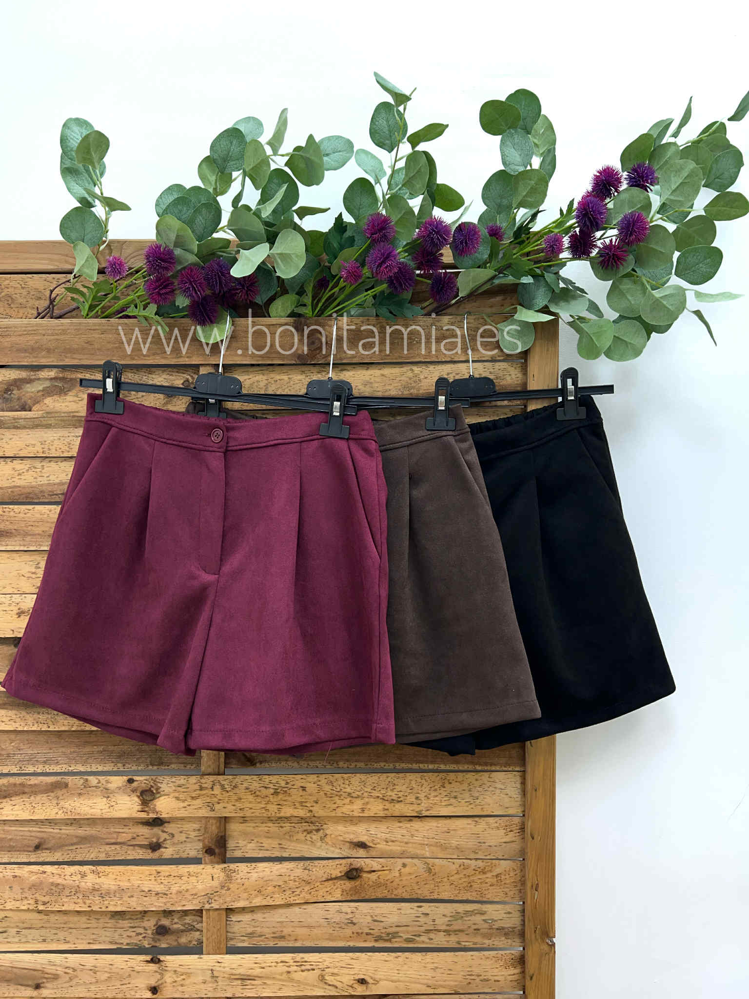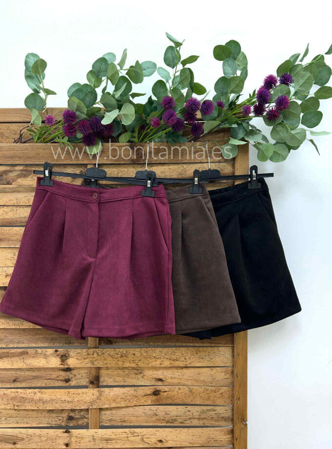 Short de antelina con pinzas, bolsillos y cremallera delantera. LLeva goma en la cintura. Colores disponibles: burdeos, marrón chocolate y negro.