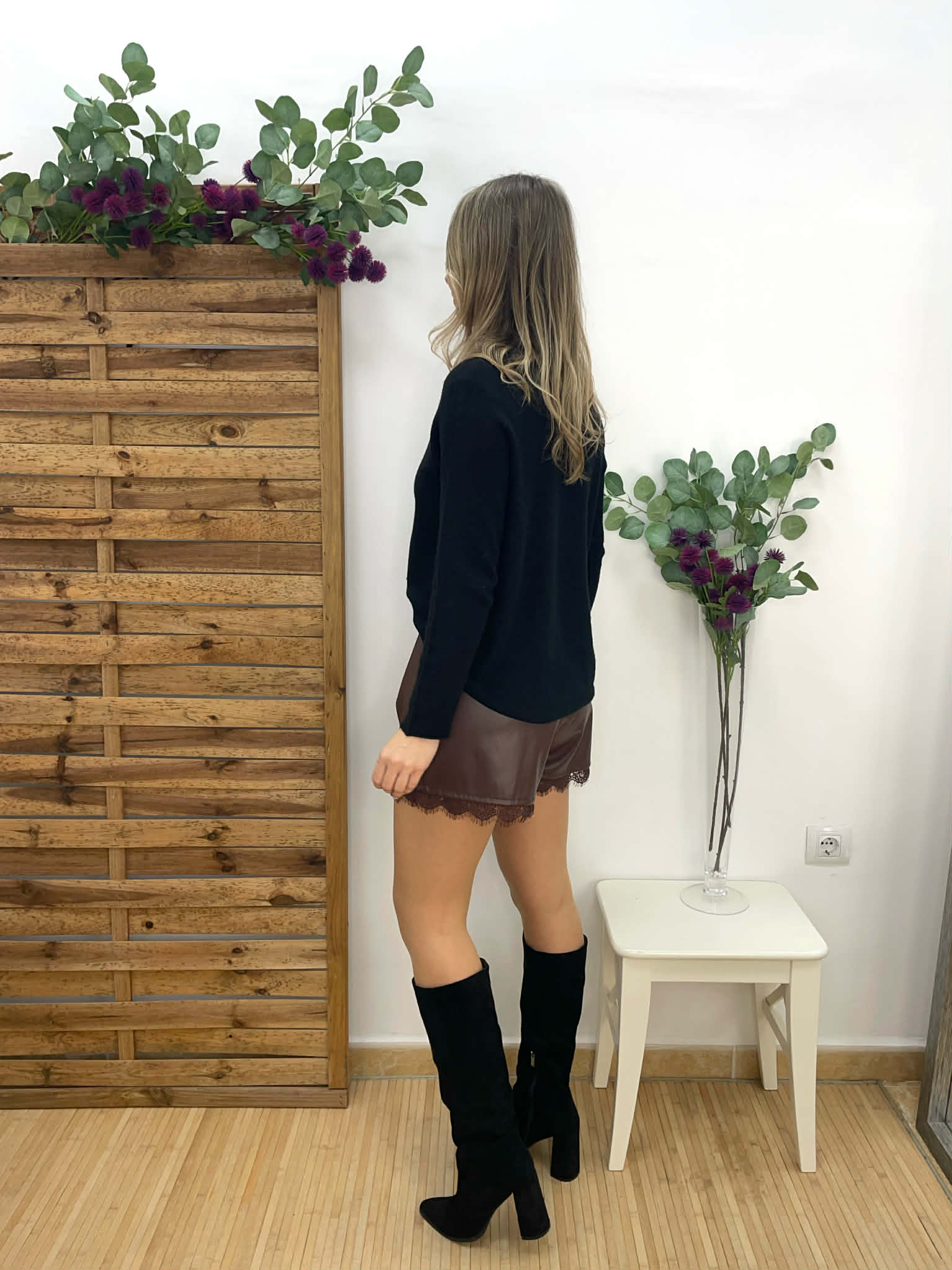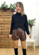 Short de polipiel marrón chocolate con detalle de encaje en el bajo y bolsillos delanteros. Incluye cinturón de polipiel negro.