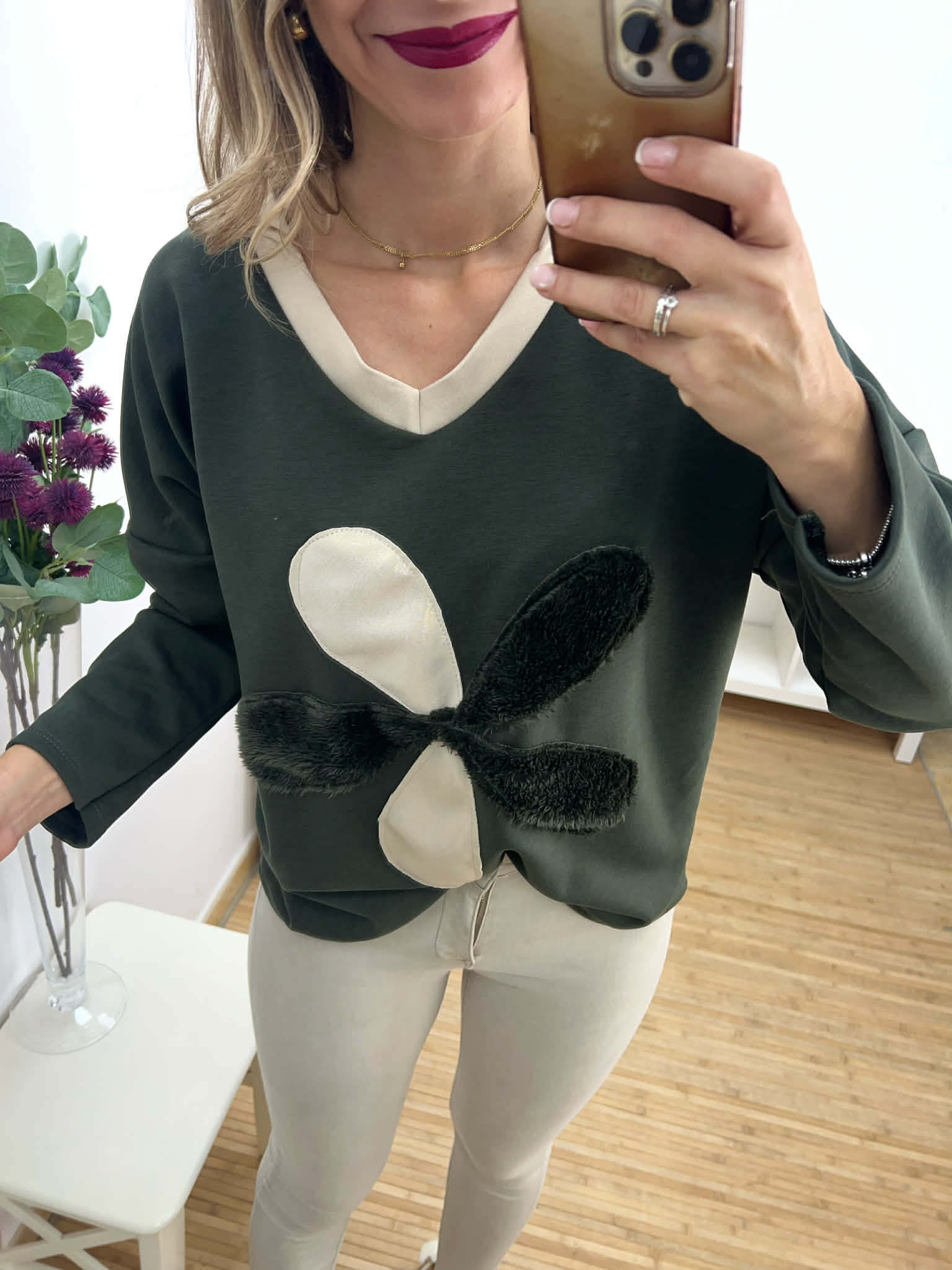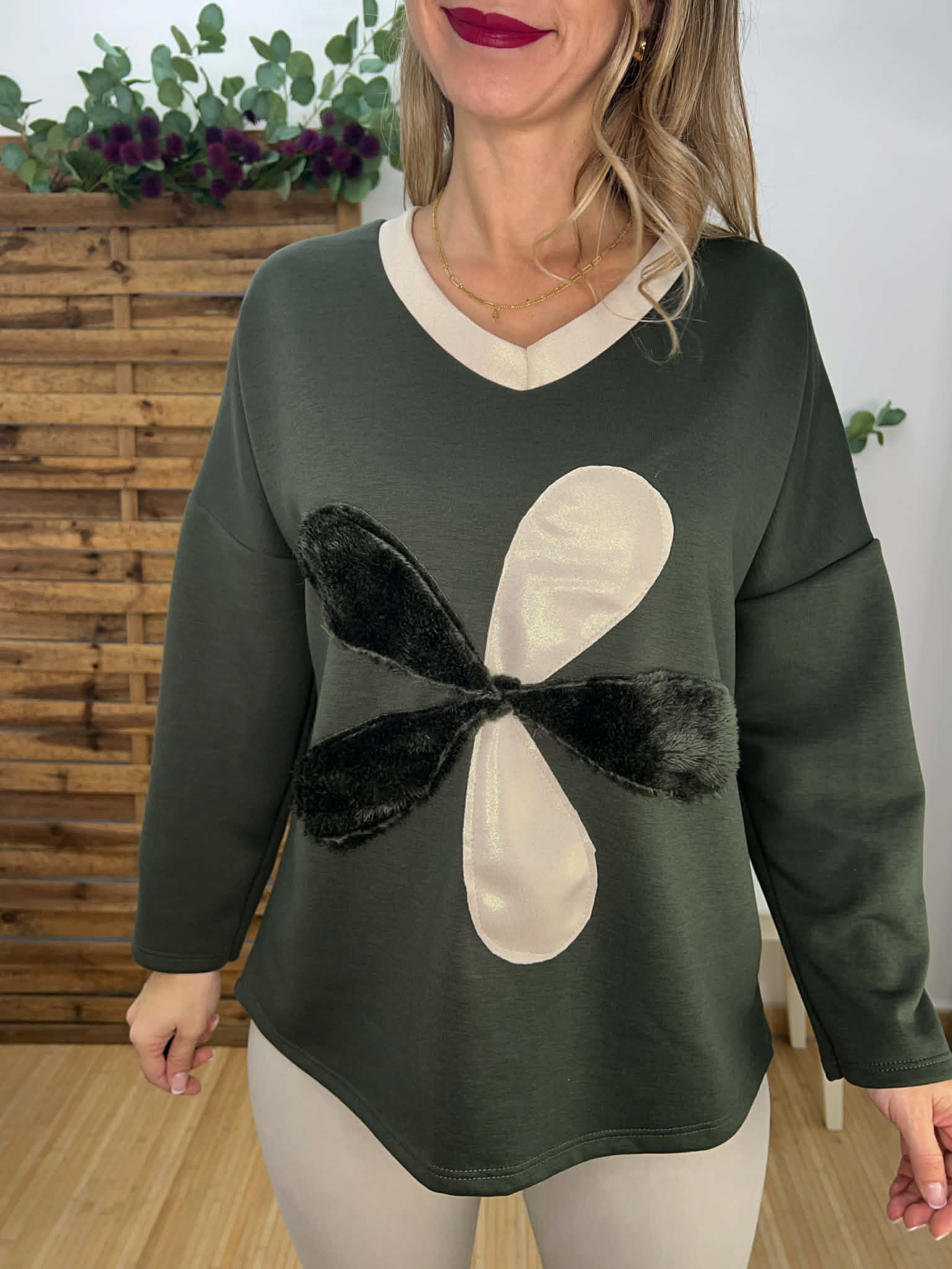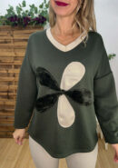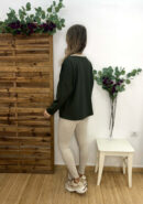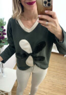 Sudadera oversize suave verde militar con filo en beige y dorado y flor con pelito.