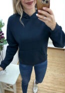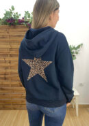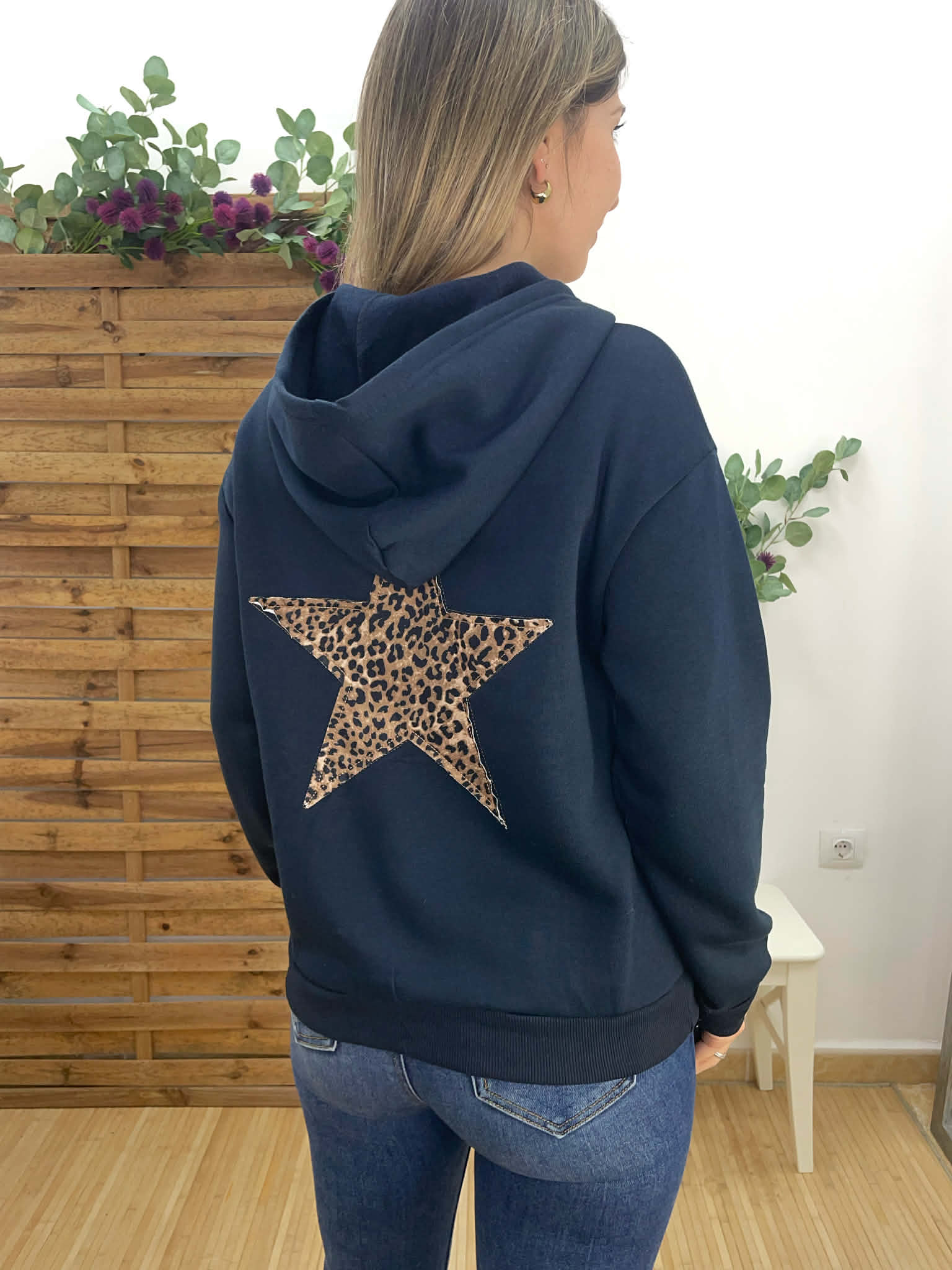 Sudadera oversize en color azul marino con bolsillo en la parte delantera y diseño de estrella en estampado leopardo en la parte trasera. Tiene pelito interior.