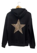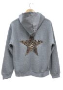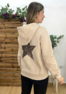 Sudadera oversize con bolsillo en la parte delantera y diseño de estrella en estampado leopardo en la parte trasera. Tiene pelito interior. Colores disponibles: beige, negro y gris.