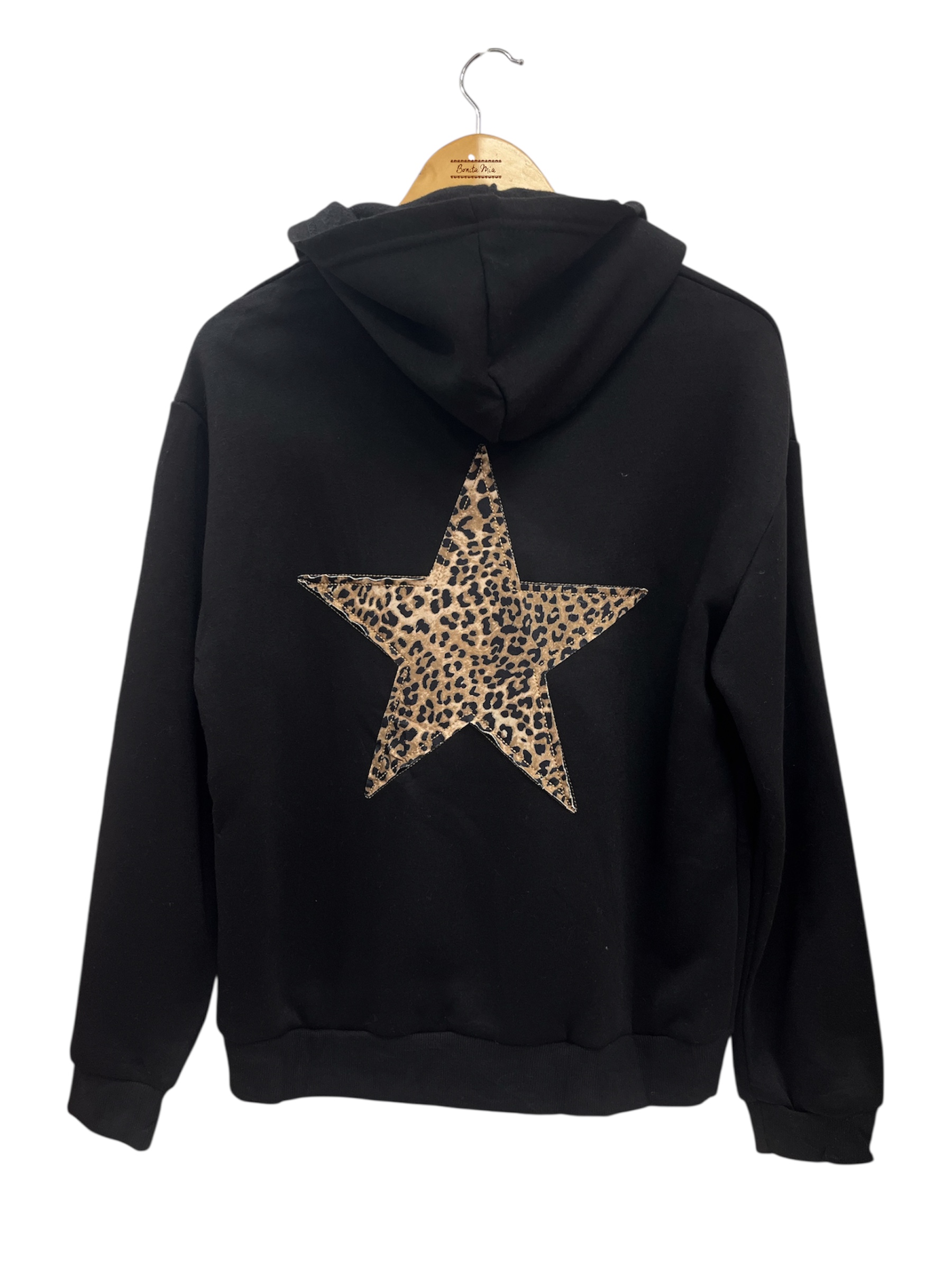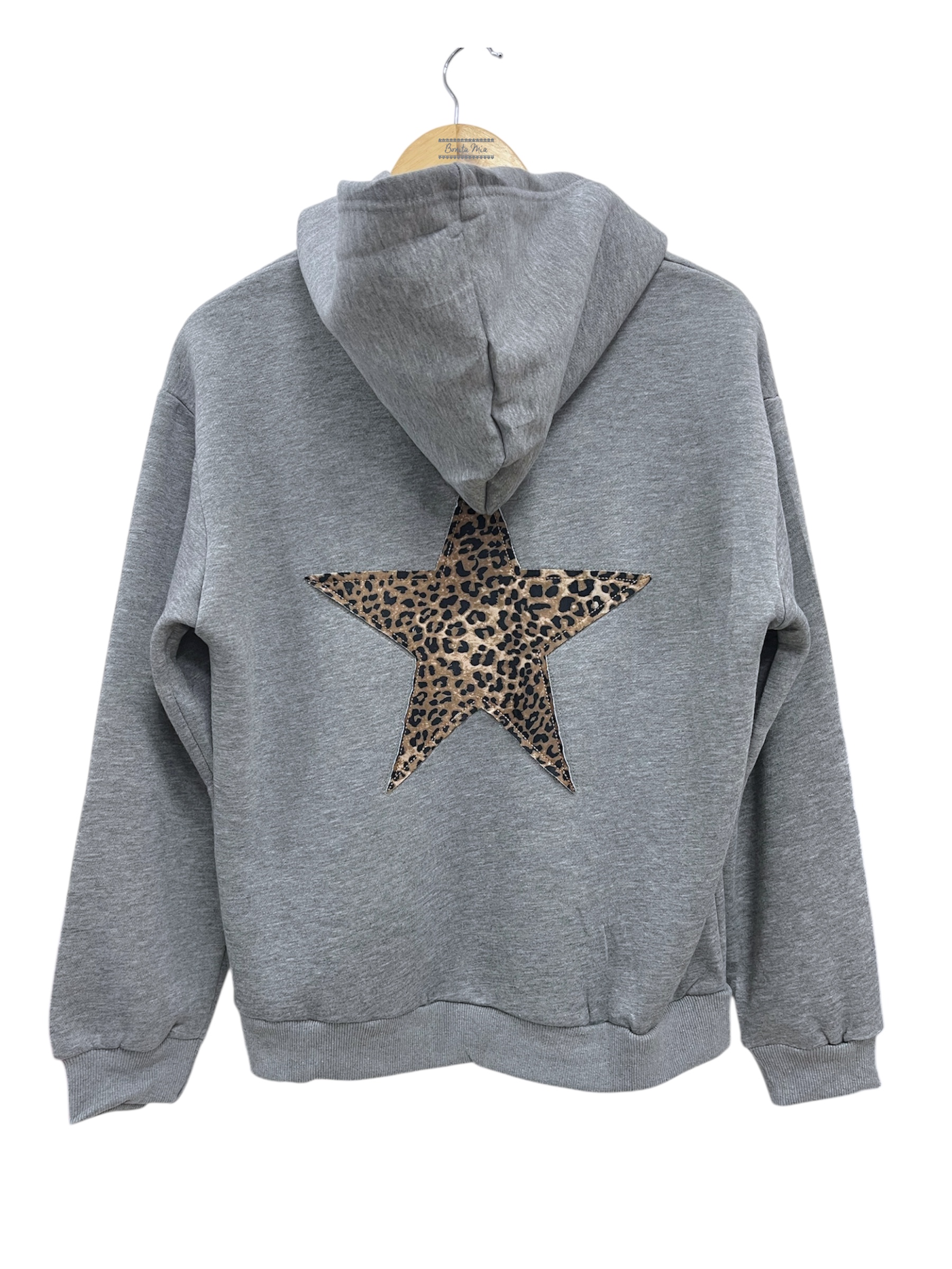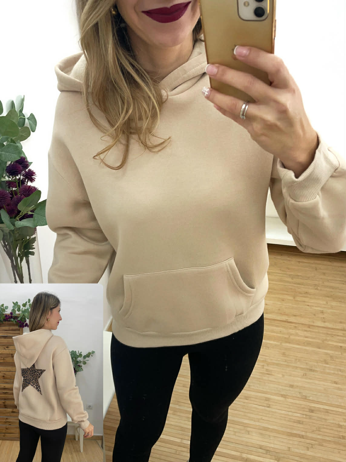 Sudadera oversize con bolsillo en la parte delantera y diseño de estrella en estampado leopardo en la parte trasera. Tiene pelito interior. Colores disponibles: beige, negro y gris.