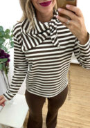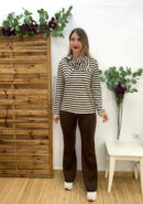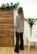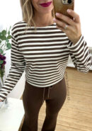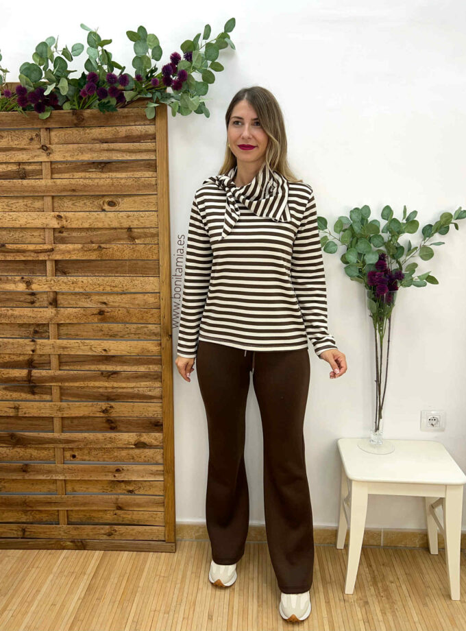 Sudadera de rayas en tono beige y chocolate con pañuelo para anudar al cuello. Parte trasera un poco más larga.