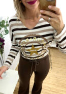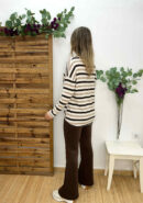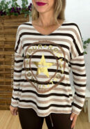 Suéter oversize de rayas con escote en pico en tonos marrón chocolate y taupe con detalle de dibujo en dorado.