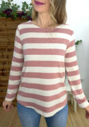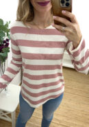 Suéter de punto de rayas rosa palo y beige, cuello redondo y bajo redondeado.