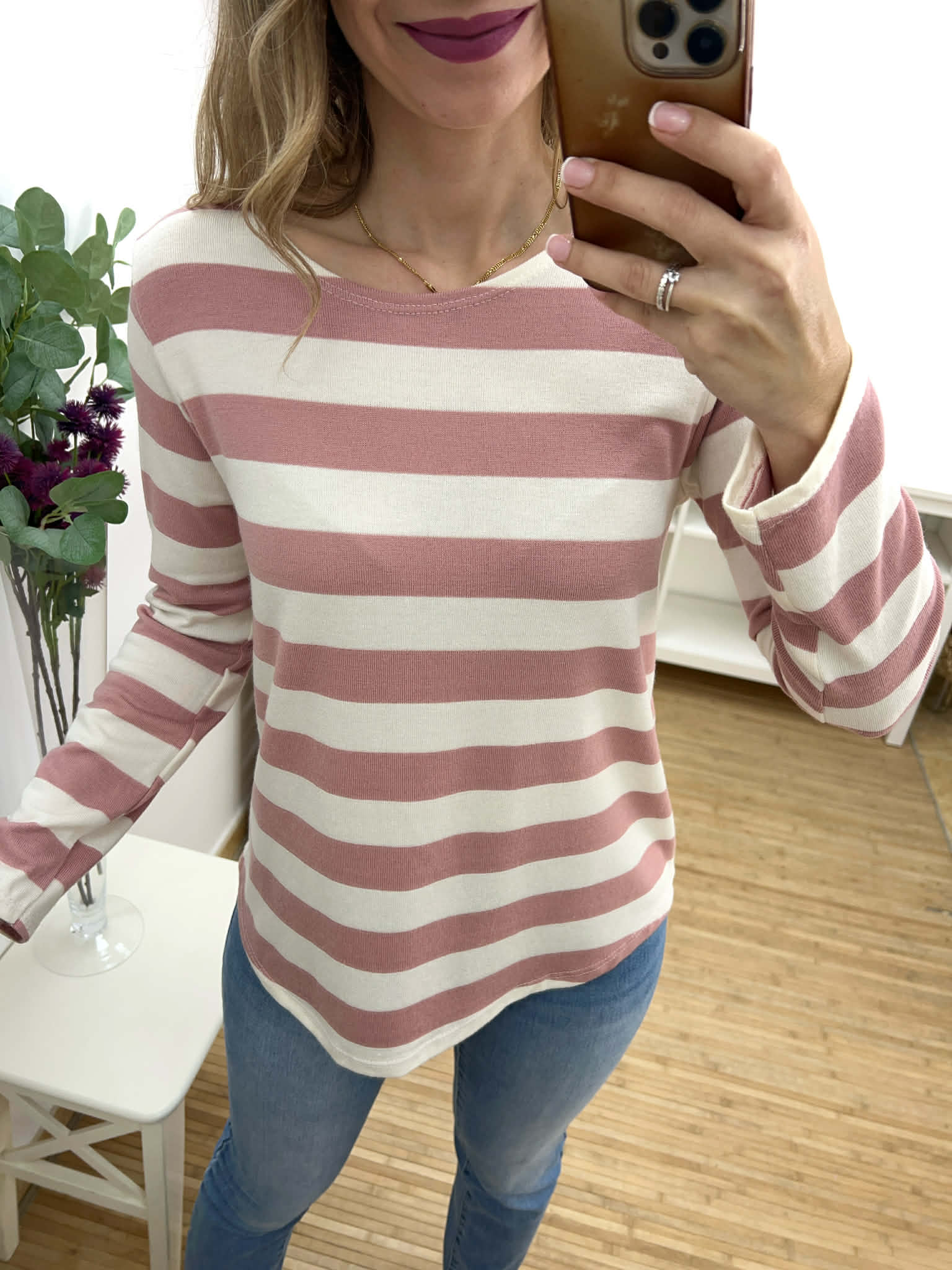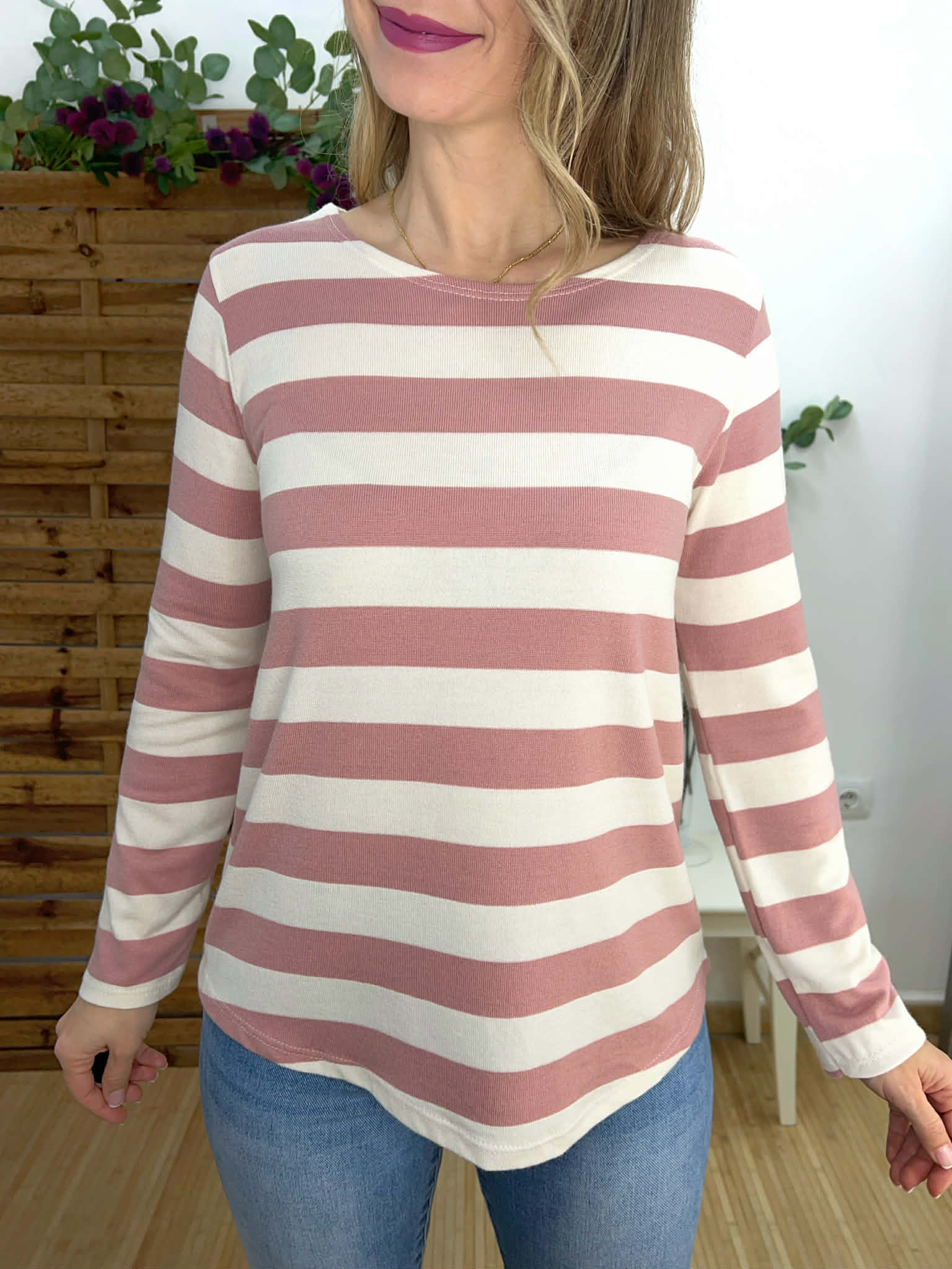 Suéter de punto de rayas rosa palo y beige, cuello redondo y bajo redondeado.