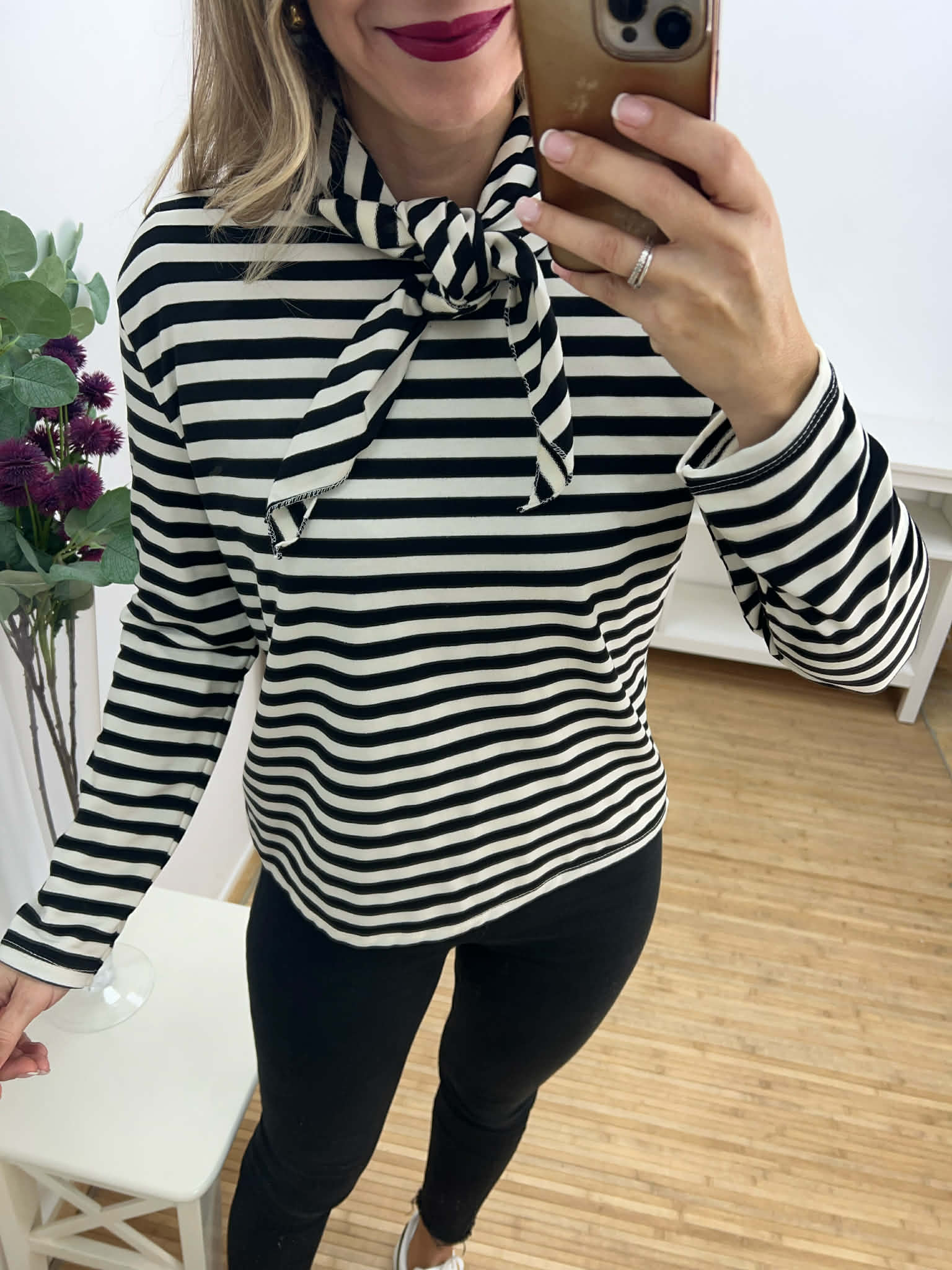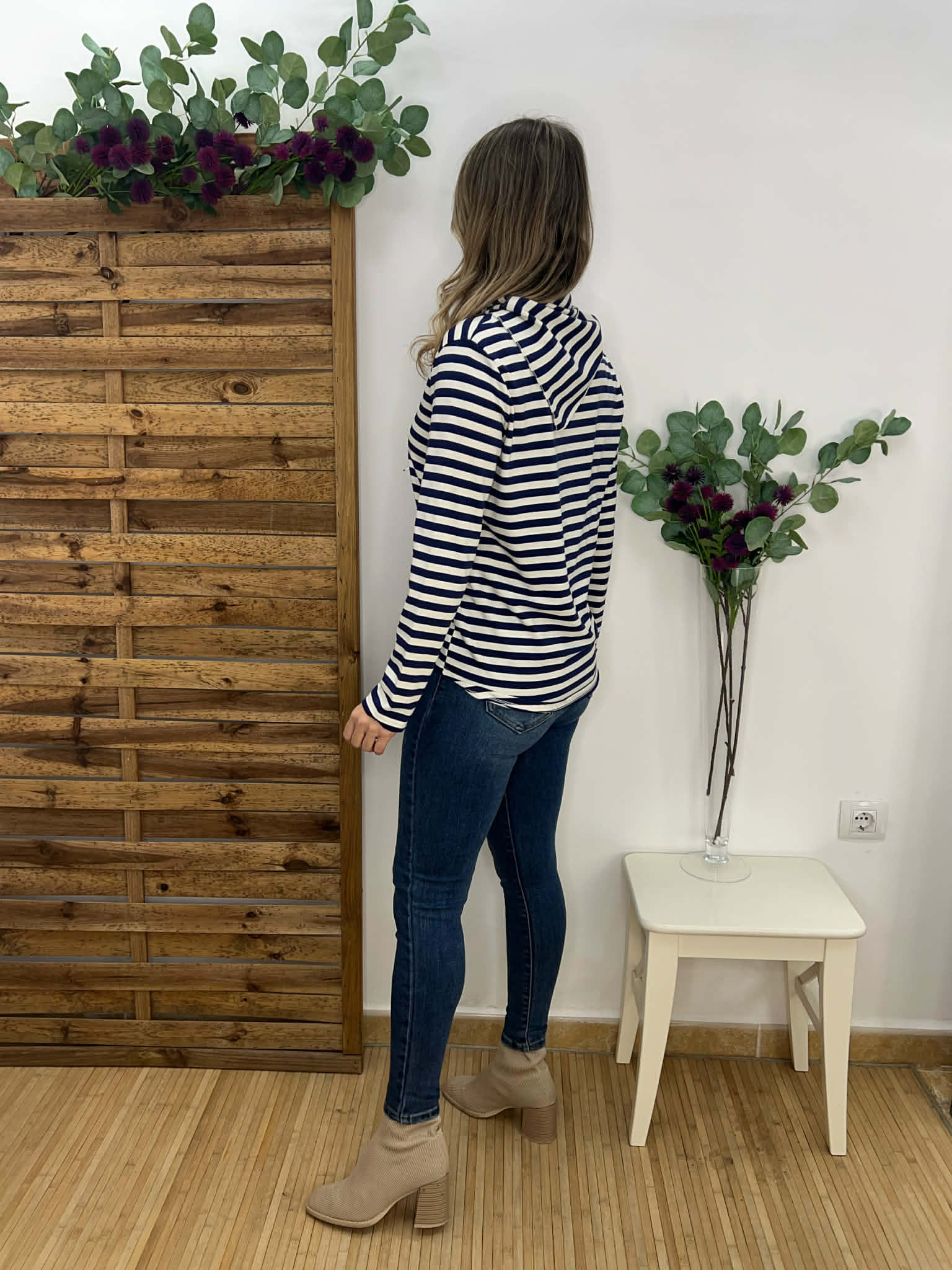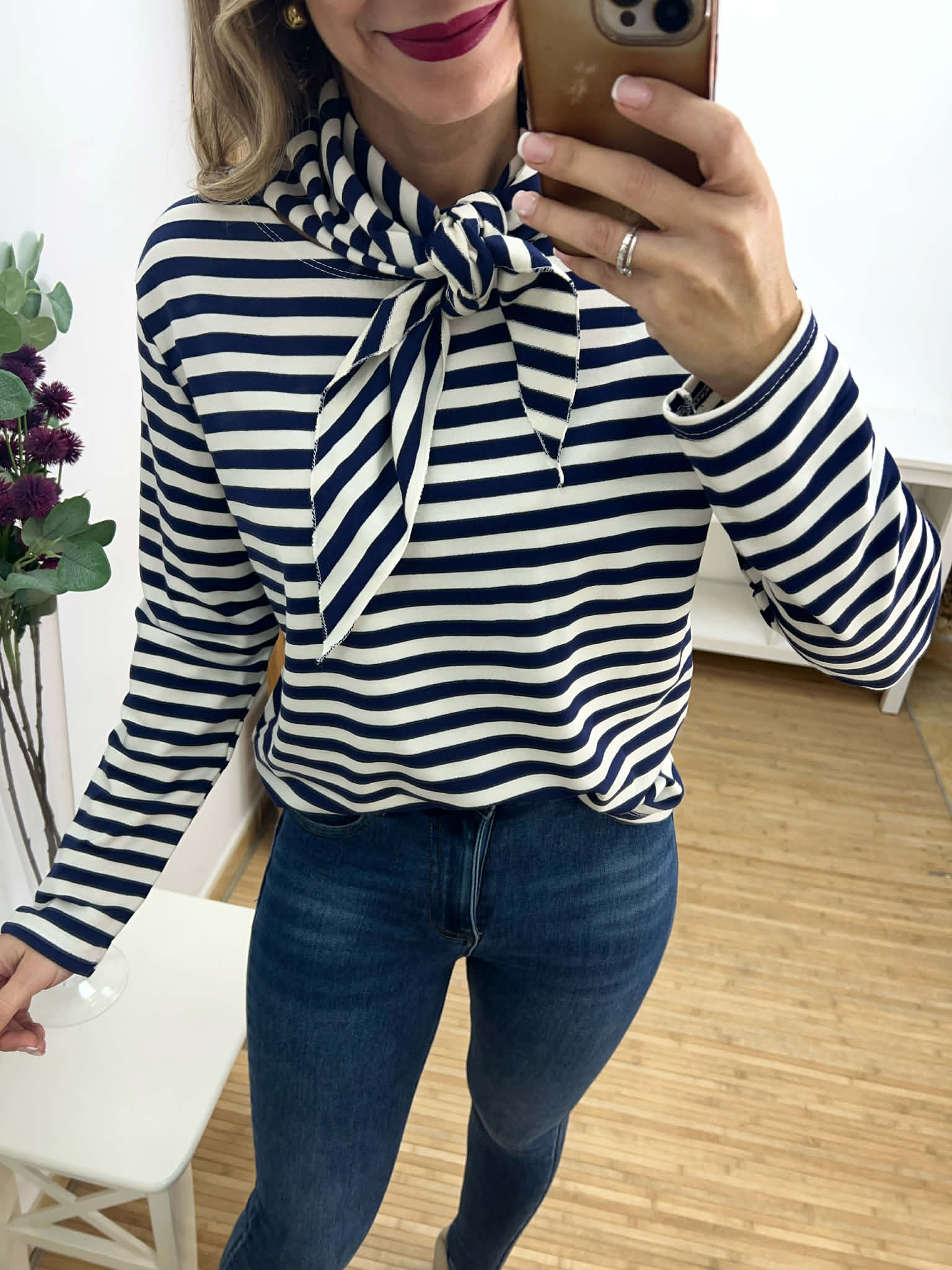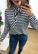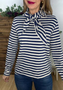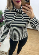 Suéter de manga larga de rayas y pañuelo a juego. Colores disponibles: negro y azul marino.