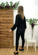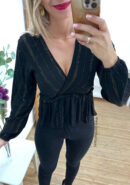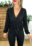 Top fluido en color negro con hilo dorado, goma en la cintura y en los puños, volantillo en el bajo y escote cruzado.