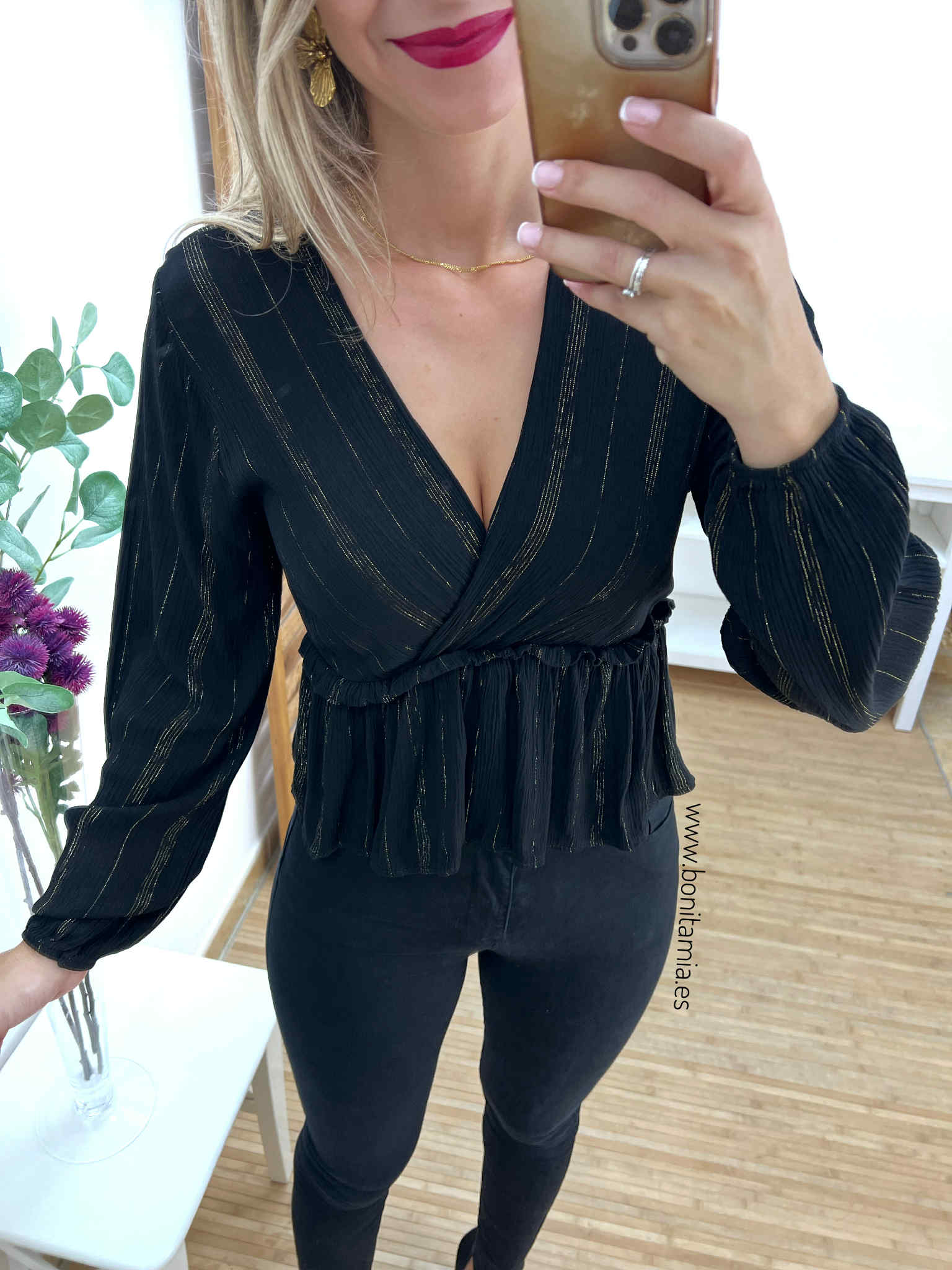 Top fluido en color negro con hilo dorado, goma en la cintura y en los puños, volantillo en el bajo y escote cruzado.