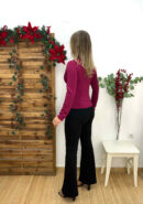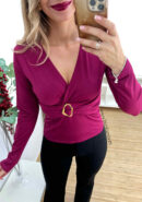 Top color cereza de licra en manga larga con escote cruzado y adorno dorado de metal.