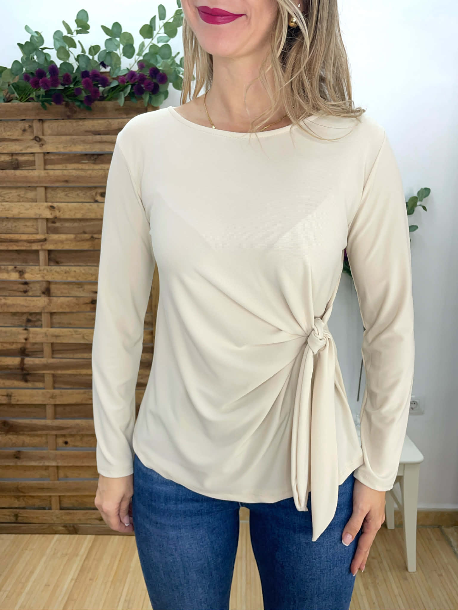 Top de licra en color beige con lazada lateral.