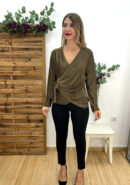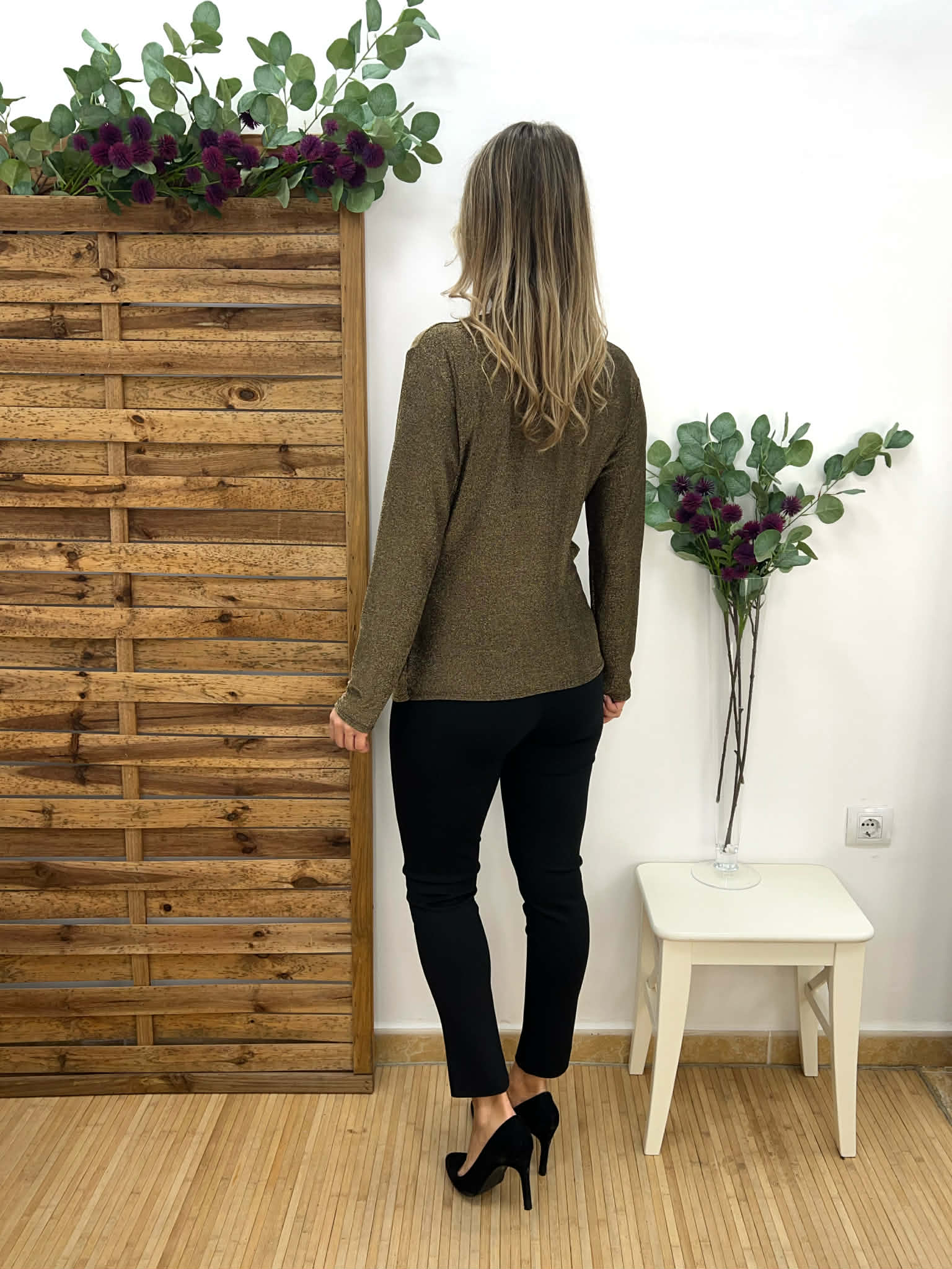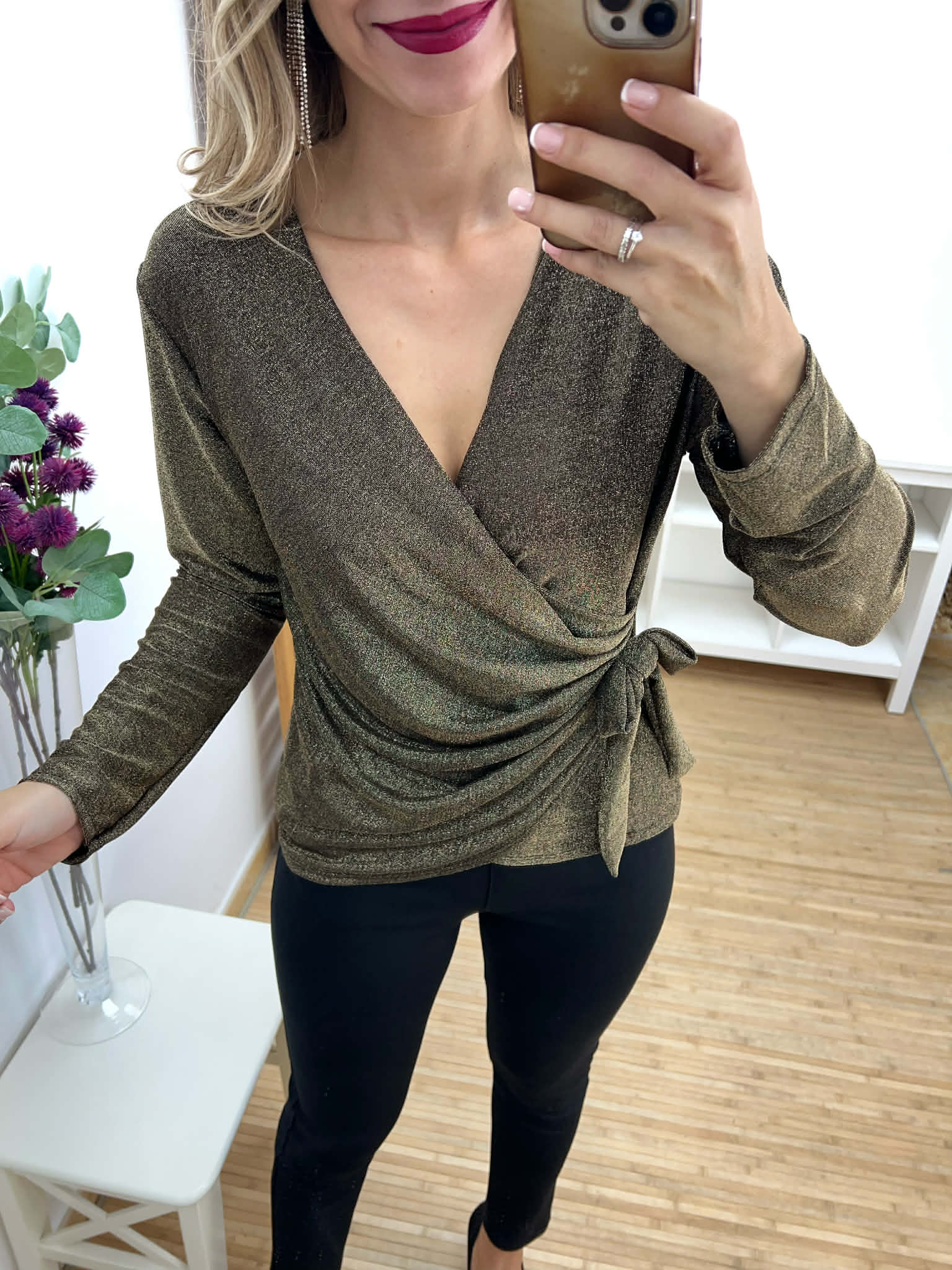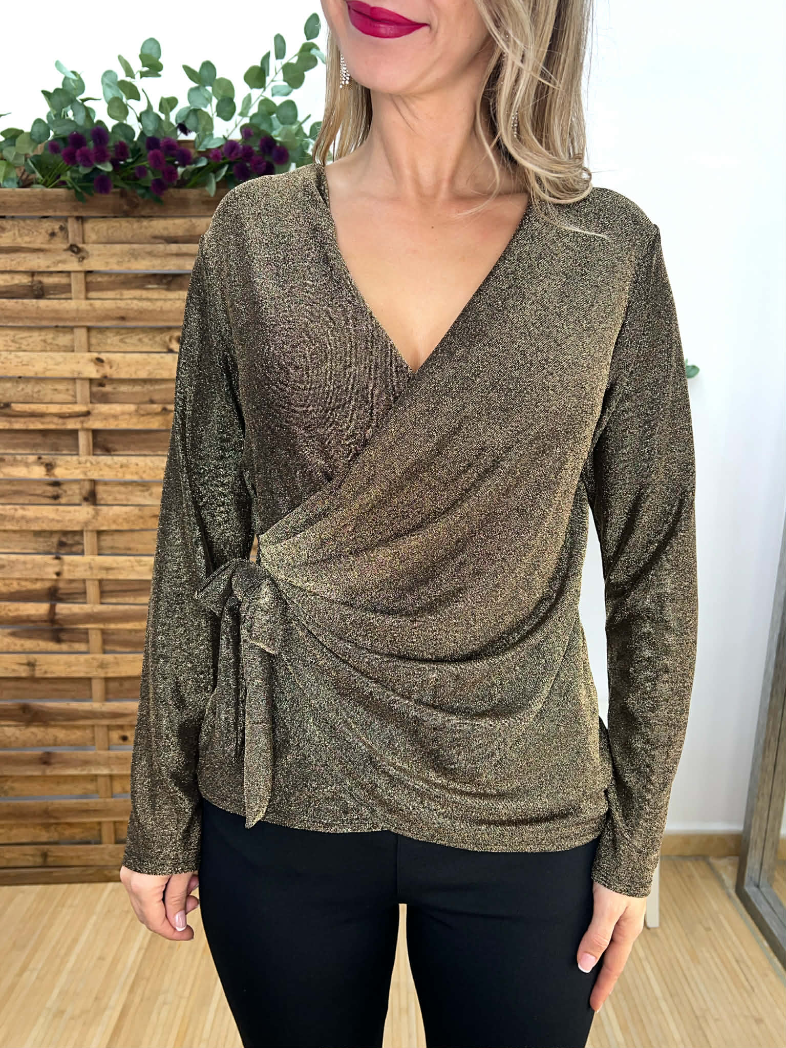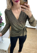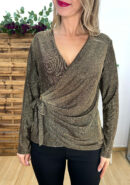 Top en tejido lurex de brillo dorado cogido en lateral con lazada decorativa.