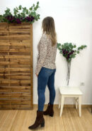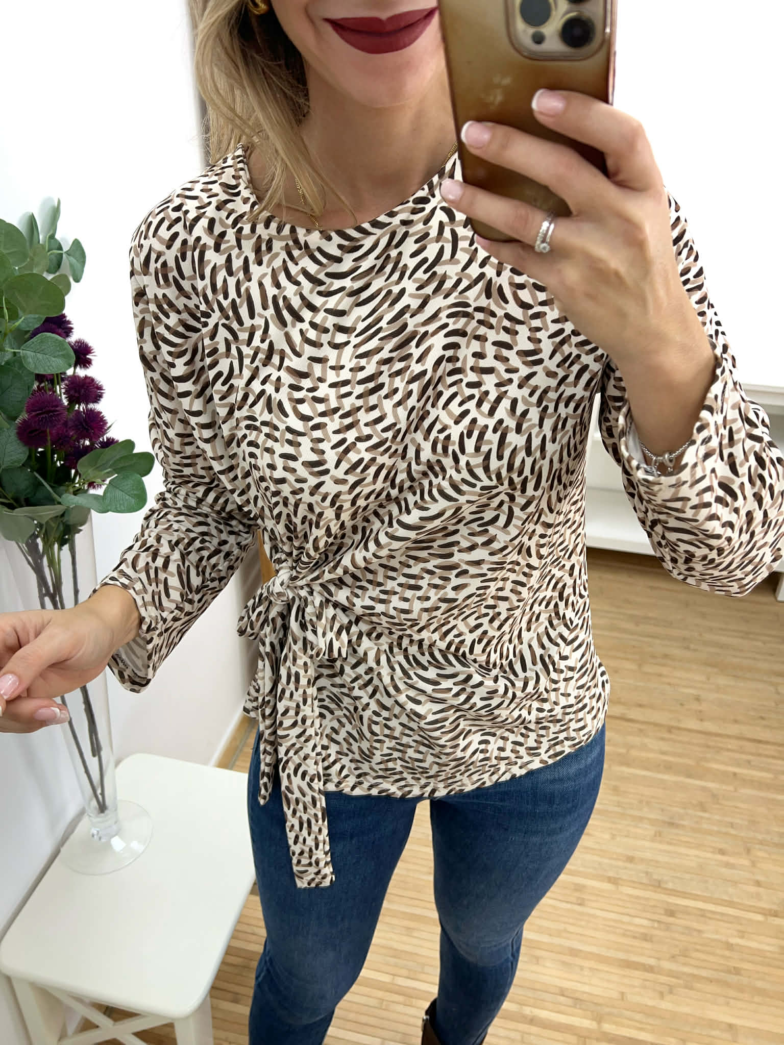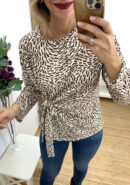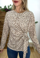 Top estampado de licra en tonos beige, camel y marrón con lazada lateral.