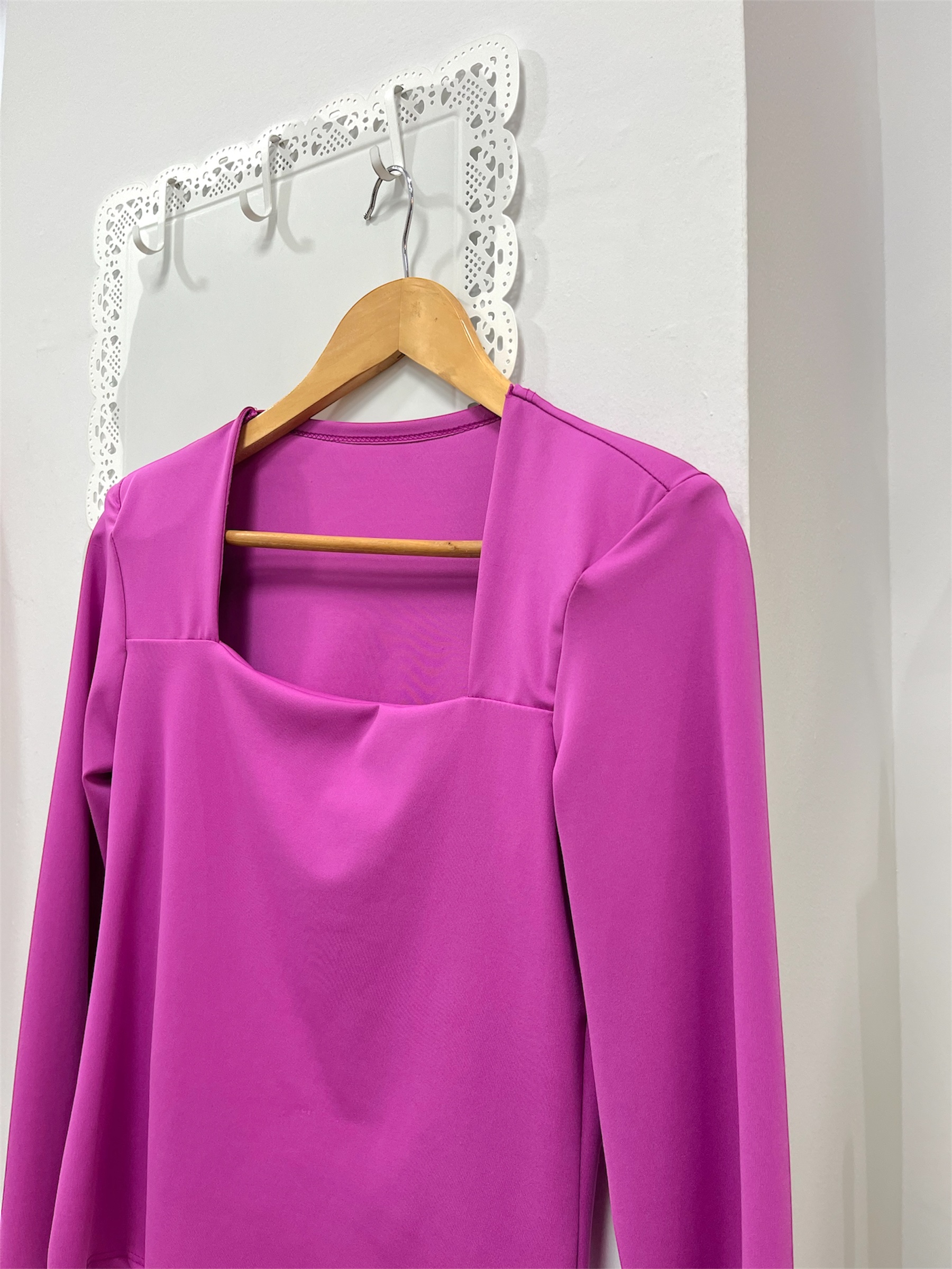 Top de licra buganvilla de manga larga y escote cuadrado. Lleva hombreras.