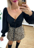 Top negro con rizo en mangas, lazada para ajustar y nido de abeja.