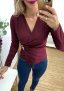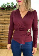 Top en color burdeos de licra en manga larga con escote cruzado y hoja metálica decorativa en el lateral.