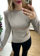 Top de licra taupé asimétrico con fruncido lateral y adorno en forma de gota dorado. Incluye hombreras.