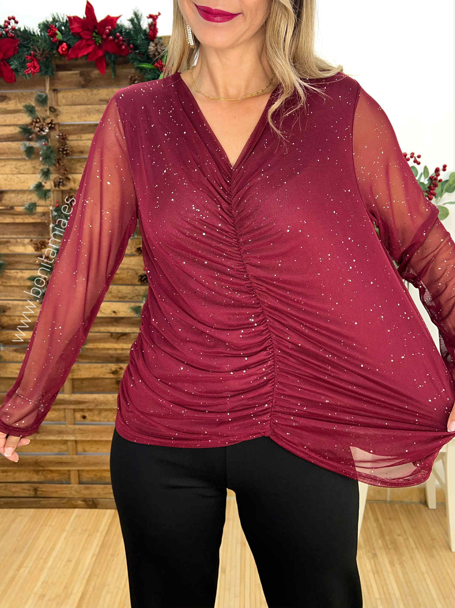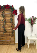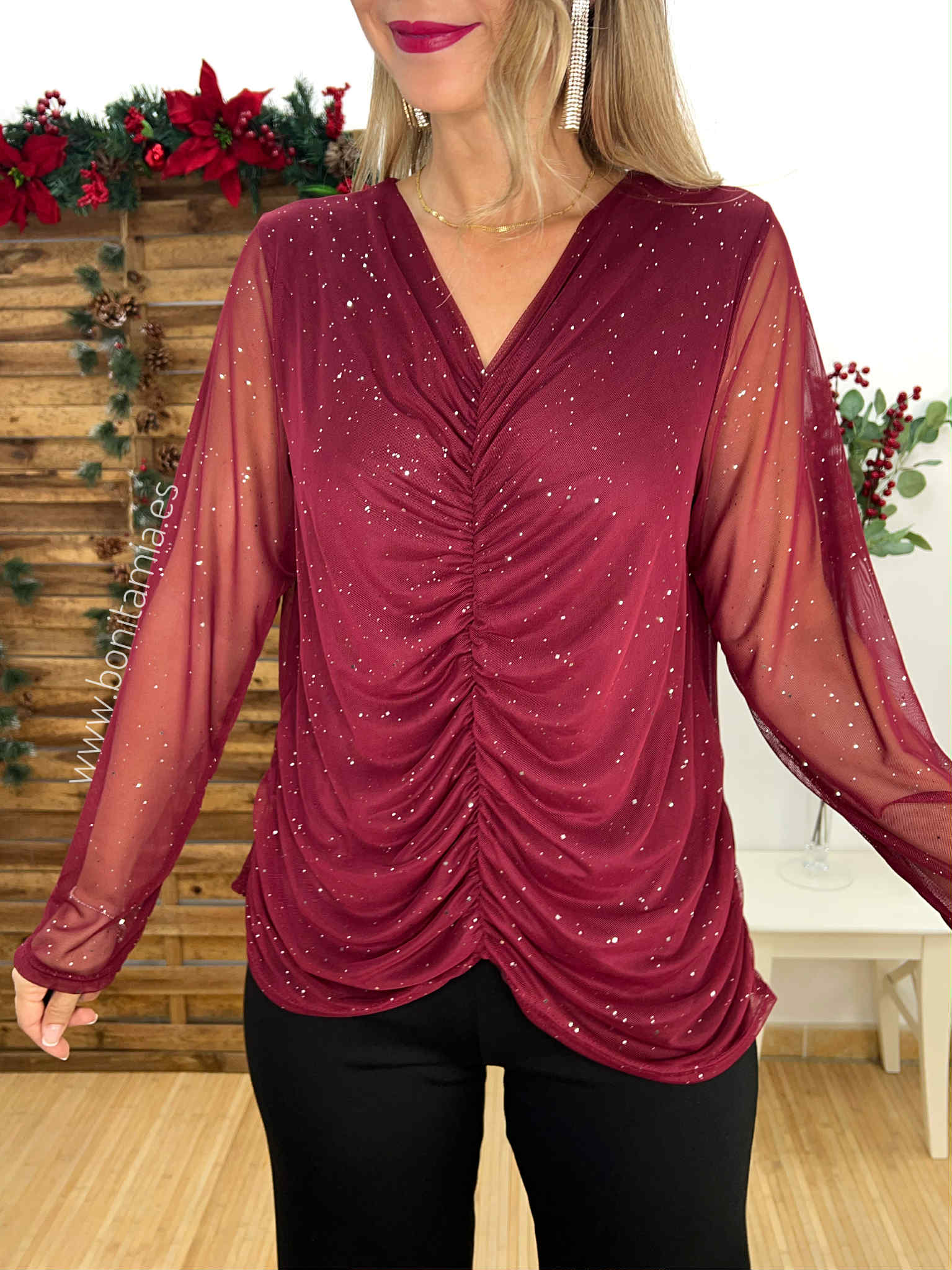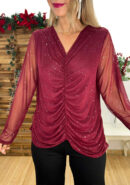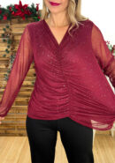 Top de tul burdeos con brillo plateado, fruncido central y forro interior.
