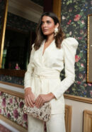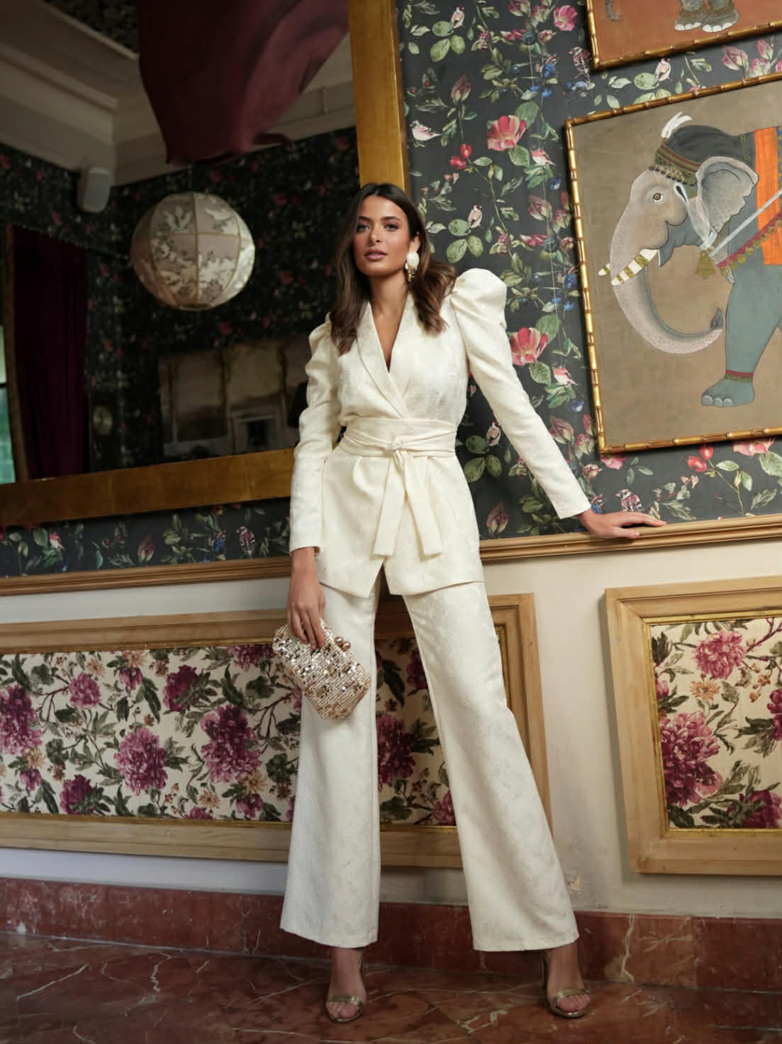 Traje beige de chaqueta con lazada y pantalón de pata recta de tejido jacquard con cremallera invisible lateral. Perfecto para comunión, bautizo…