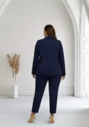 Traje azul marino de chaqueta con hombreras y forro interior. Pantalón de corte pitillo con botón y cremallera.