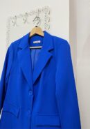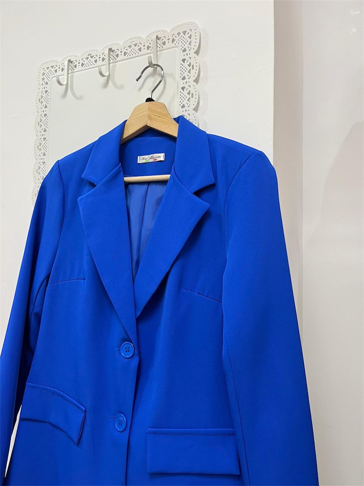 Traje azul klein de chaqueta corte long y pantalón campana. Estiliza y alarga la silueta. Chaqueta con forro interior, dos botones y hombreras. Pantalón con bolsillos laterales, botón, cremallera y goma en la cintura que se adapta.