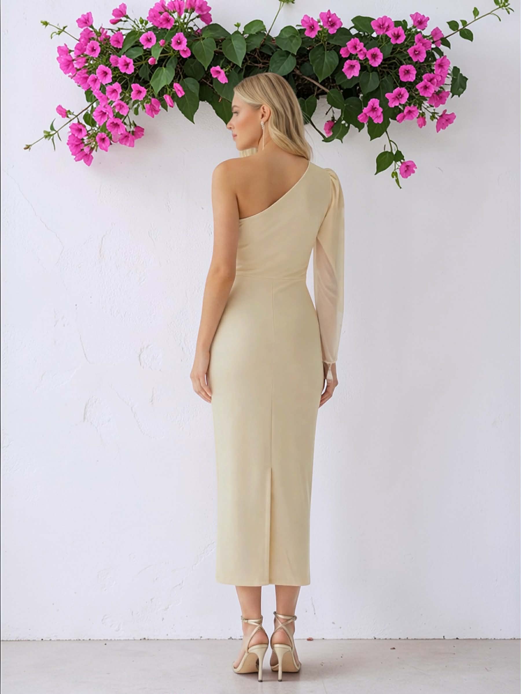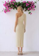 Vestido midi beige de tejido crepe con textura asimétrico de manga larga de gasa y abertura trasera. Lleva cremallera invisible lateral.