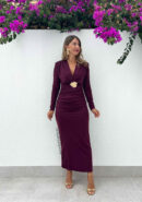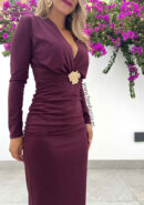 Vestido midi de licra densa burdeos de manga larga con fruncidos laterales, escote en V y adorno en tono dorado.