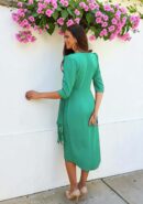 Vestido midi verde cruzado con flecos en la lazada, flor decorativa con pinza e imperdible para colocar. Incluye hombreras. Cierre con botón invisible interior.