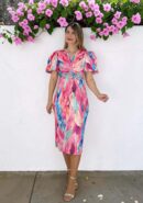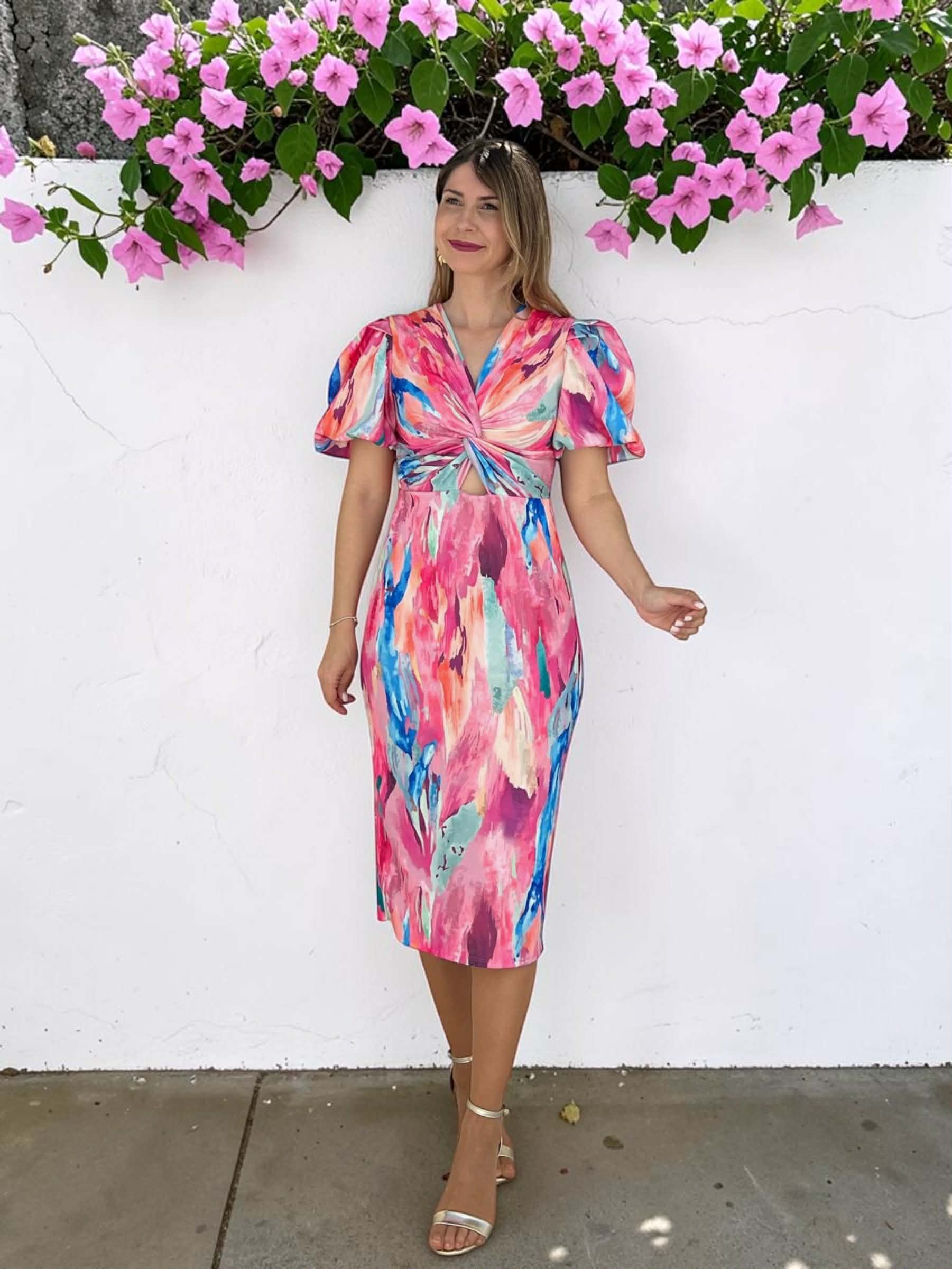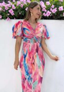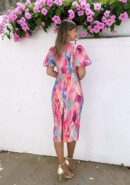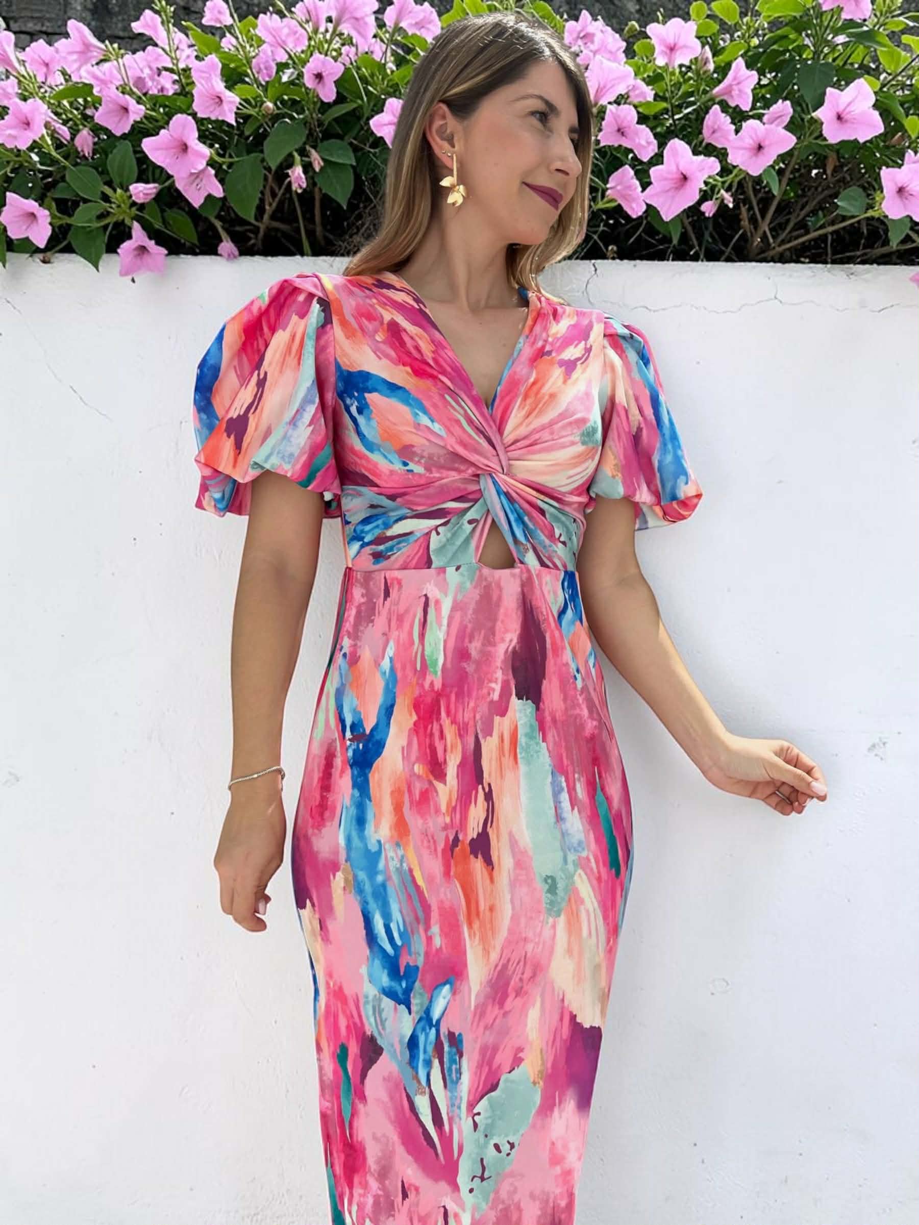 Vestido tipo midi con estampado en tonos rosa, verde manzana, naranja, azul, celeste, buganvilla.. con mangas abullonadas nudo en el escote y pequeña abertura debajo del pecho. Lleva goma en la parte de la cintura y abertura central trasera.