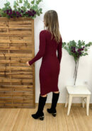 Vestido de canalé burdeos con cuello perkins, abertura lateral izquierda y detalle de botones en tono dorado.