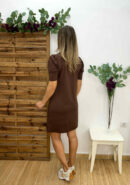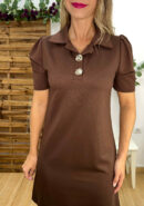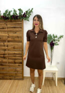 Vestido corto en color chocolate de manga corta con solapas en el cuello y cierre de 3 botones dorados.