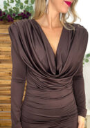 Vestido de licra chocolate corto con escote drapeado y fruncidos laterales. Lleva hombreras.