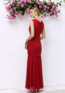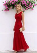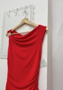 Vestido invitada rojo de punto seda y falda de gasa con adorno dorado.