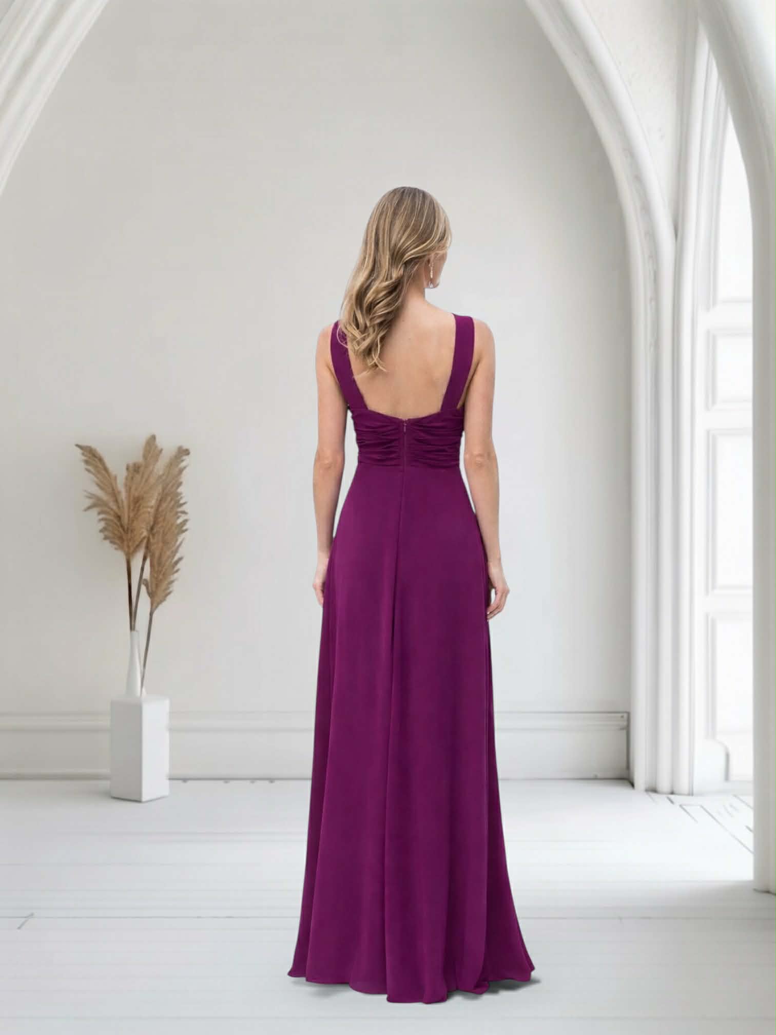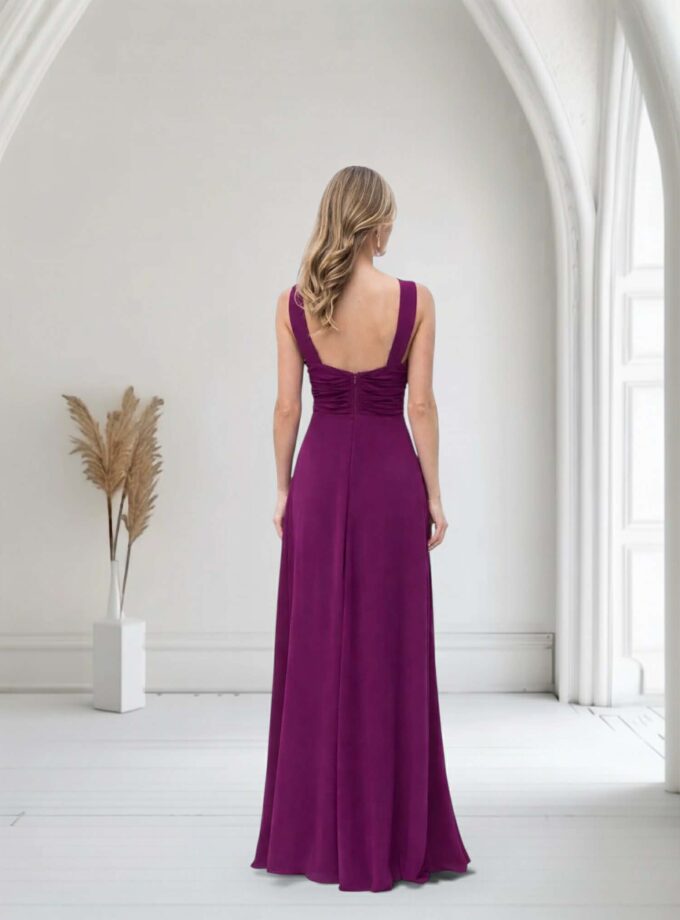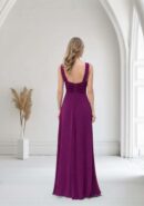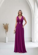 Vestido largo de fiesta en color buganvilla de gasa con detalle en cintura de abalorio rectangular plateado con cristales, tul en la parte central del pecho y cremallera invisible trasera. Contiene forro interior.