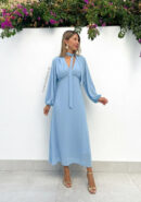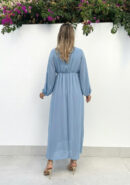 Vestido midi celeste de gasa con manga larga, escote en V y goma en la cintura. Incluye forro interior.