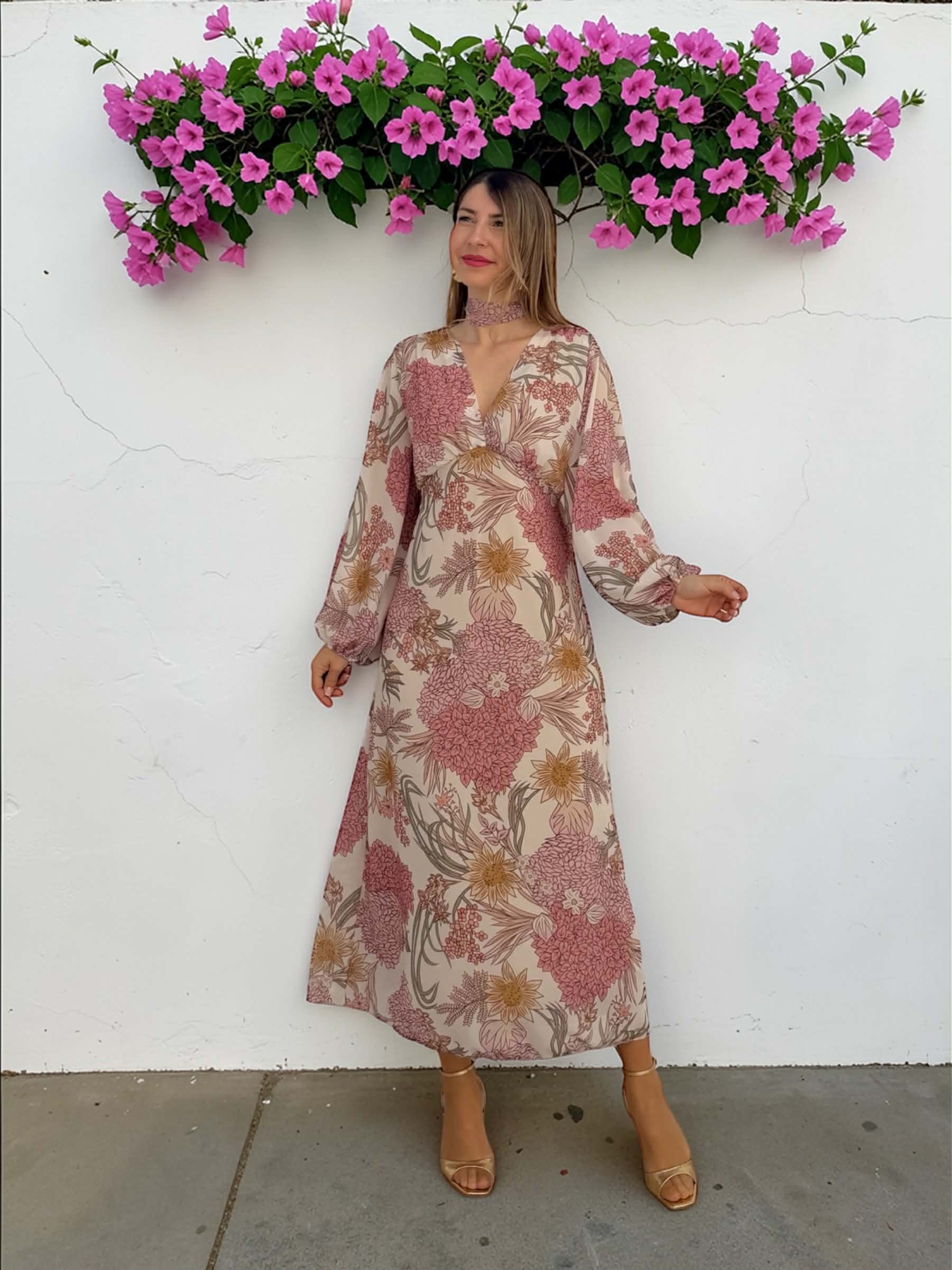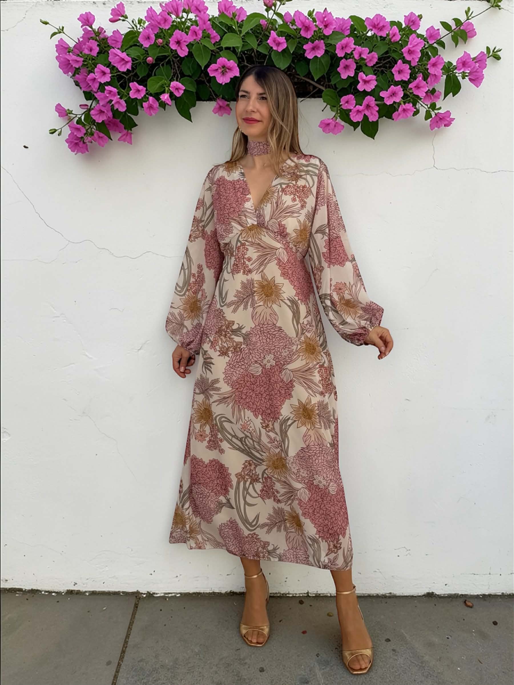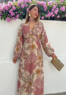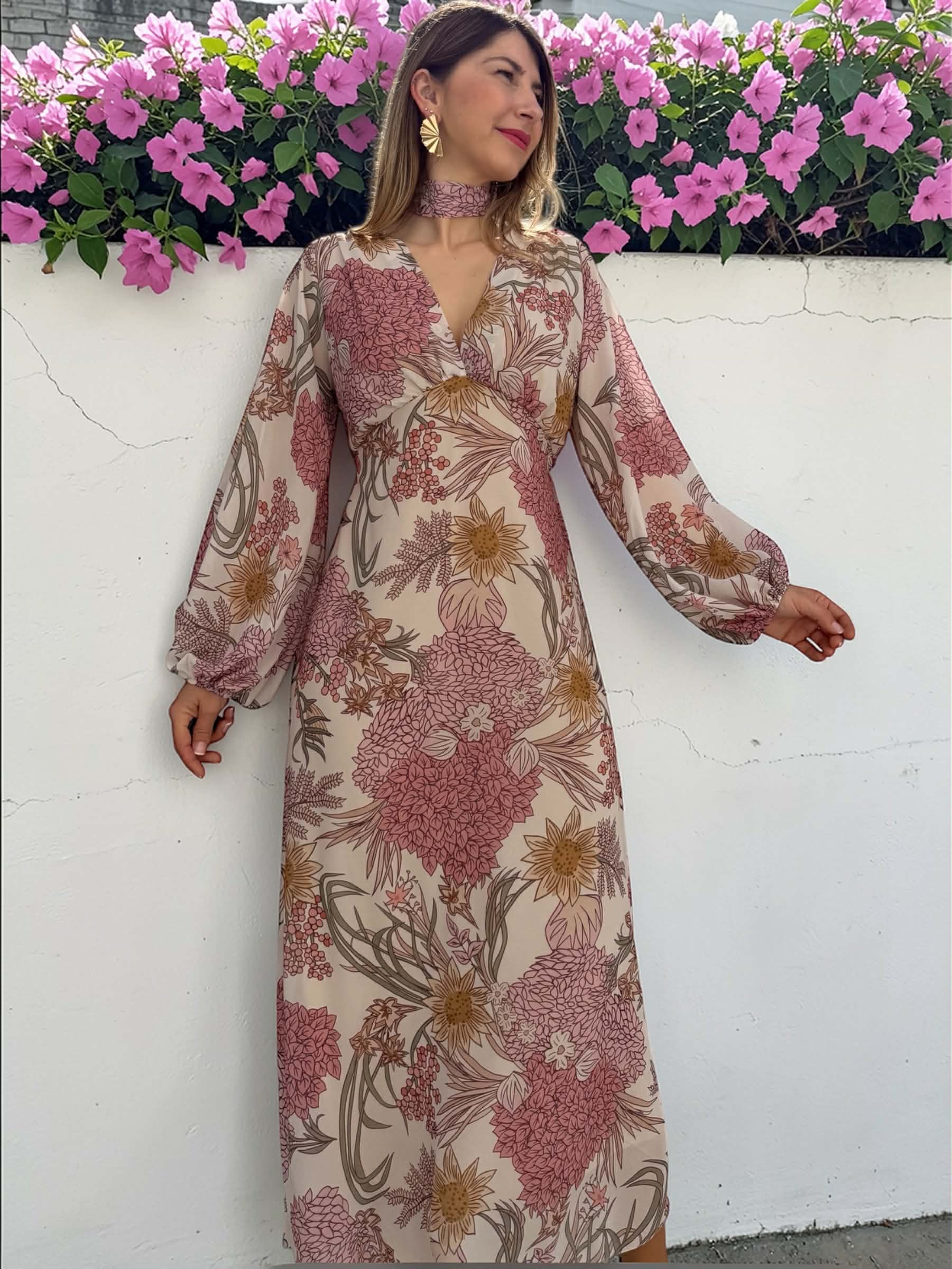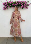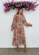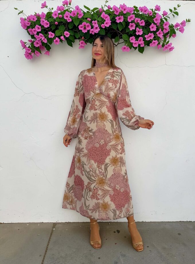 Vestido midi floral de gasa en tonos rosa, verde, beige… con manga larga, escote en V y goma en la cintura. Incluye forro interior.