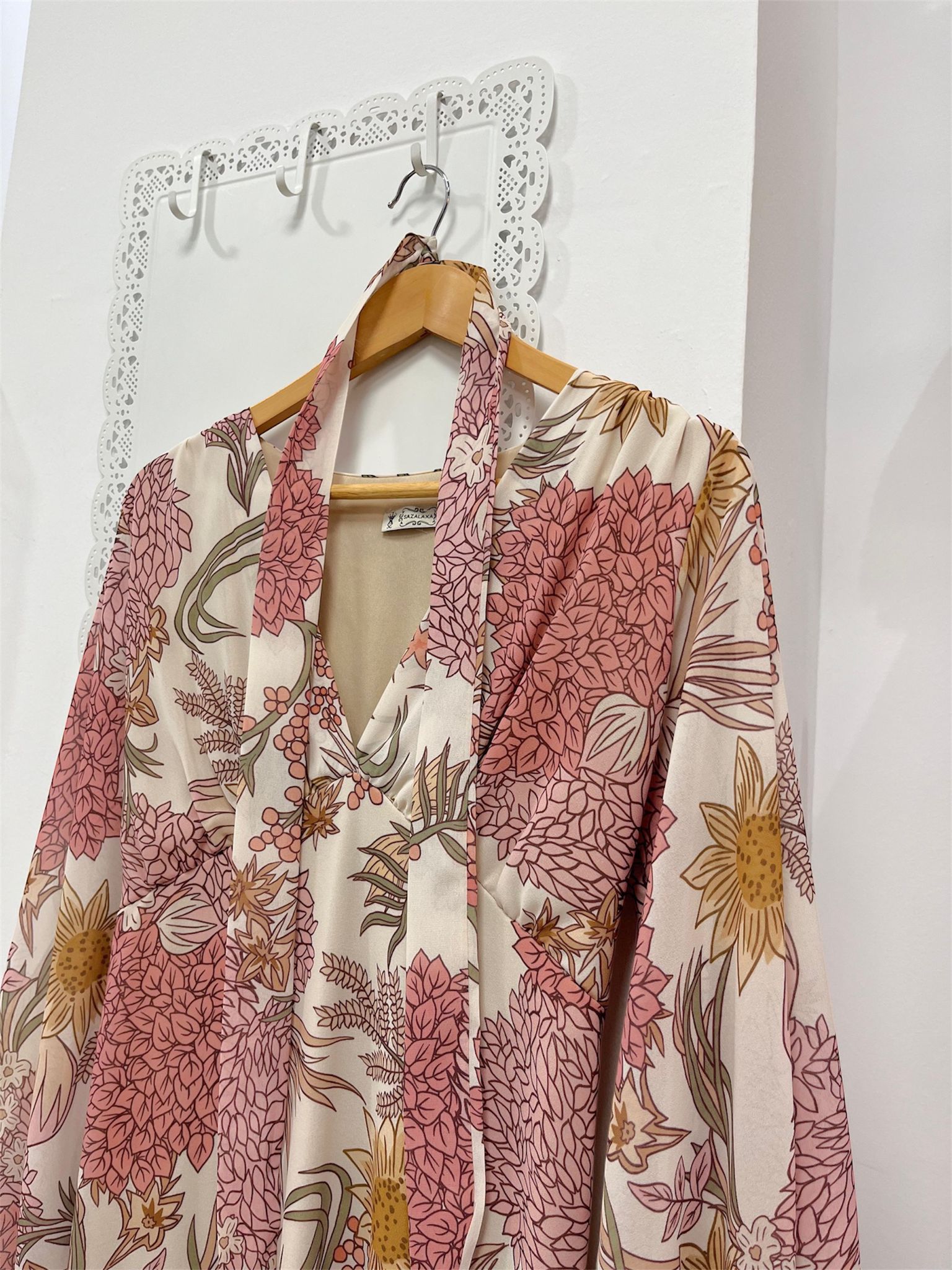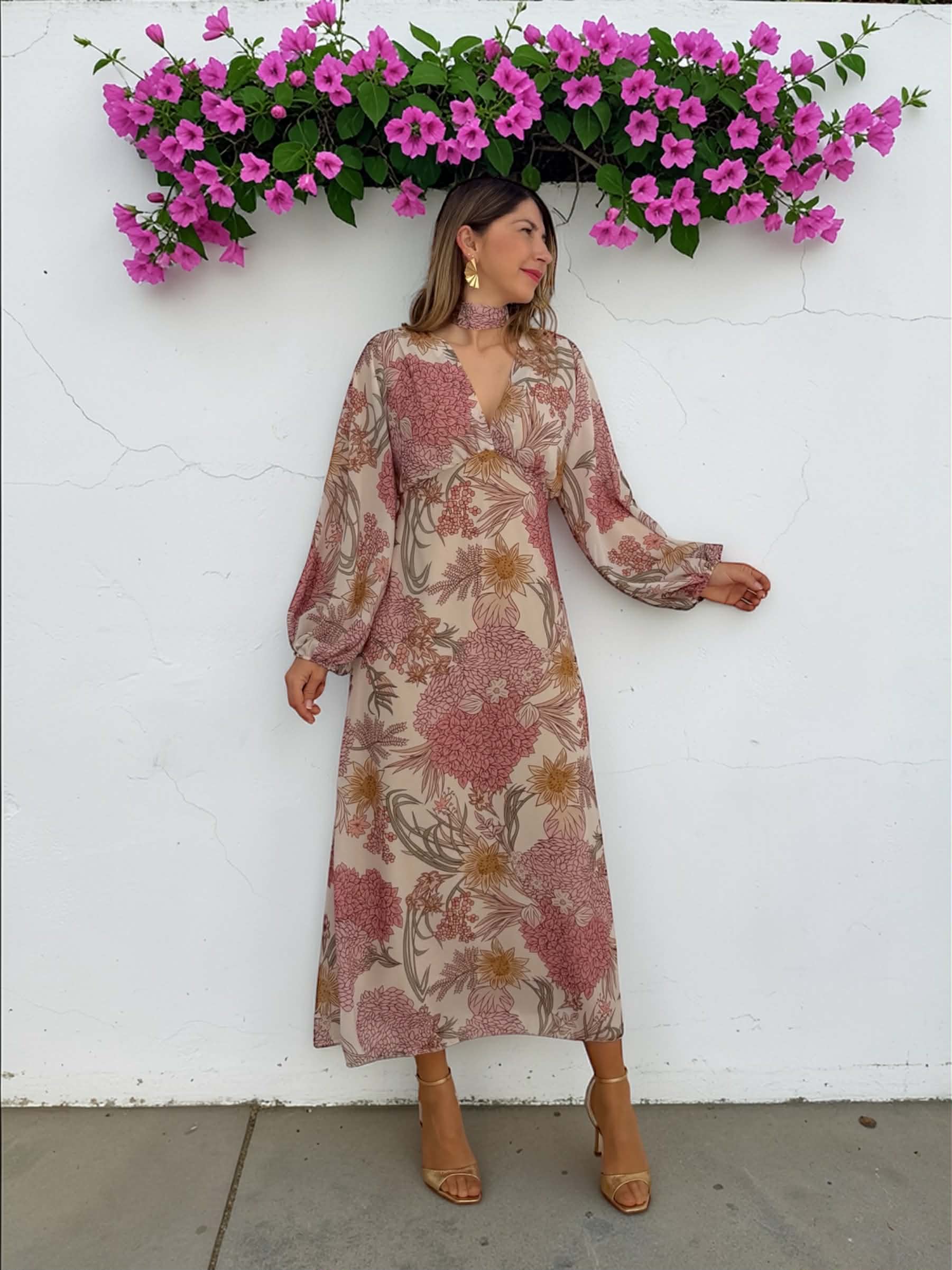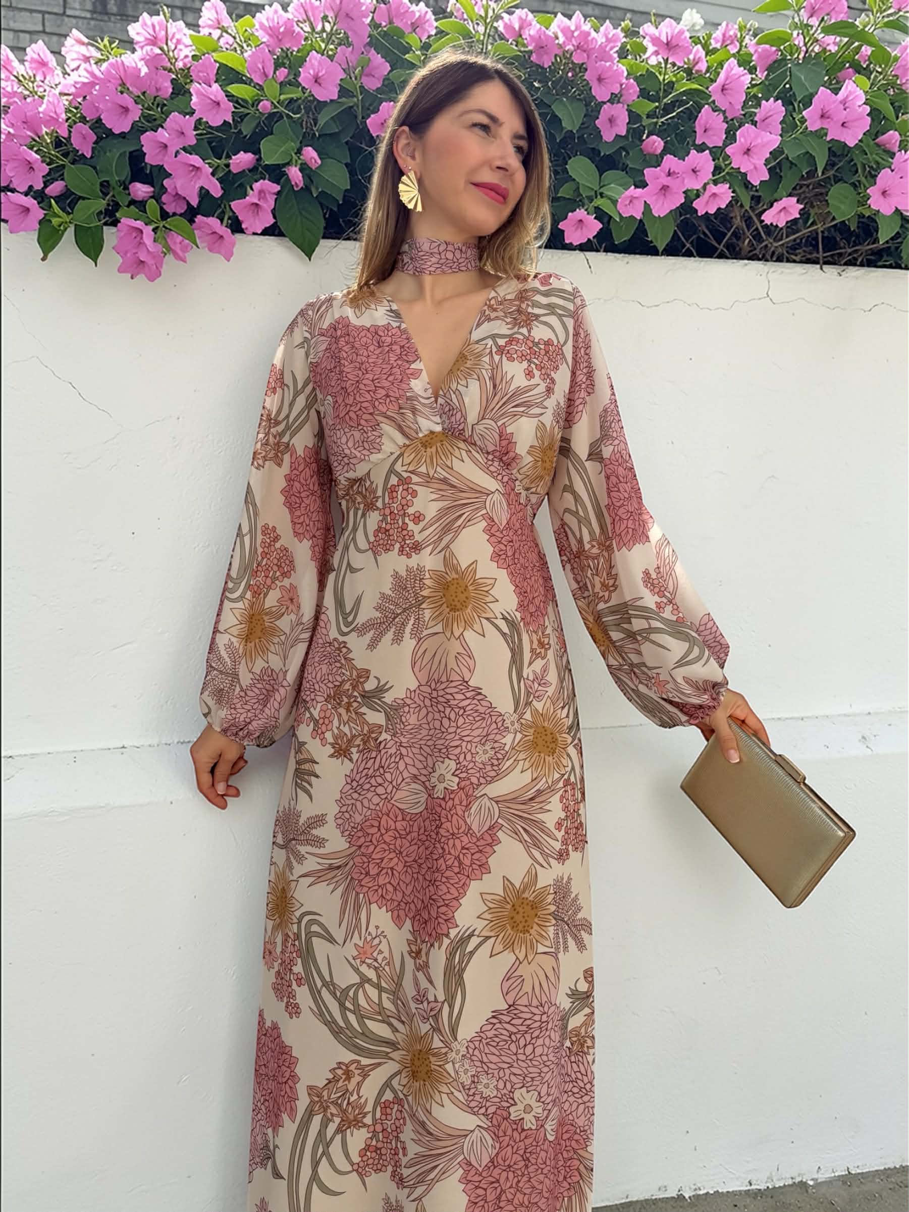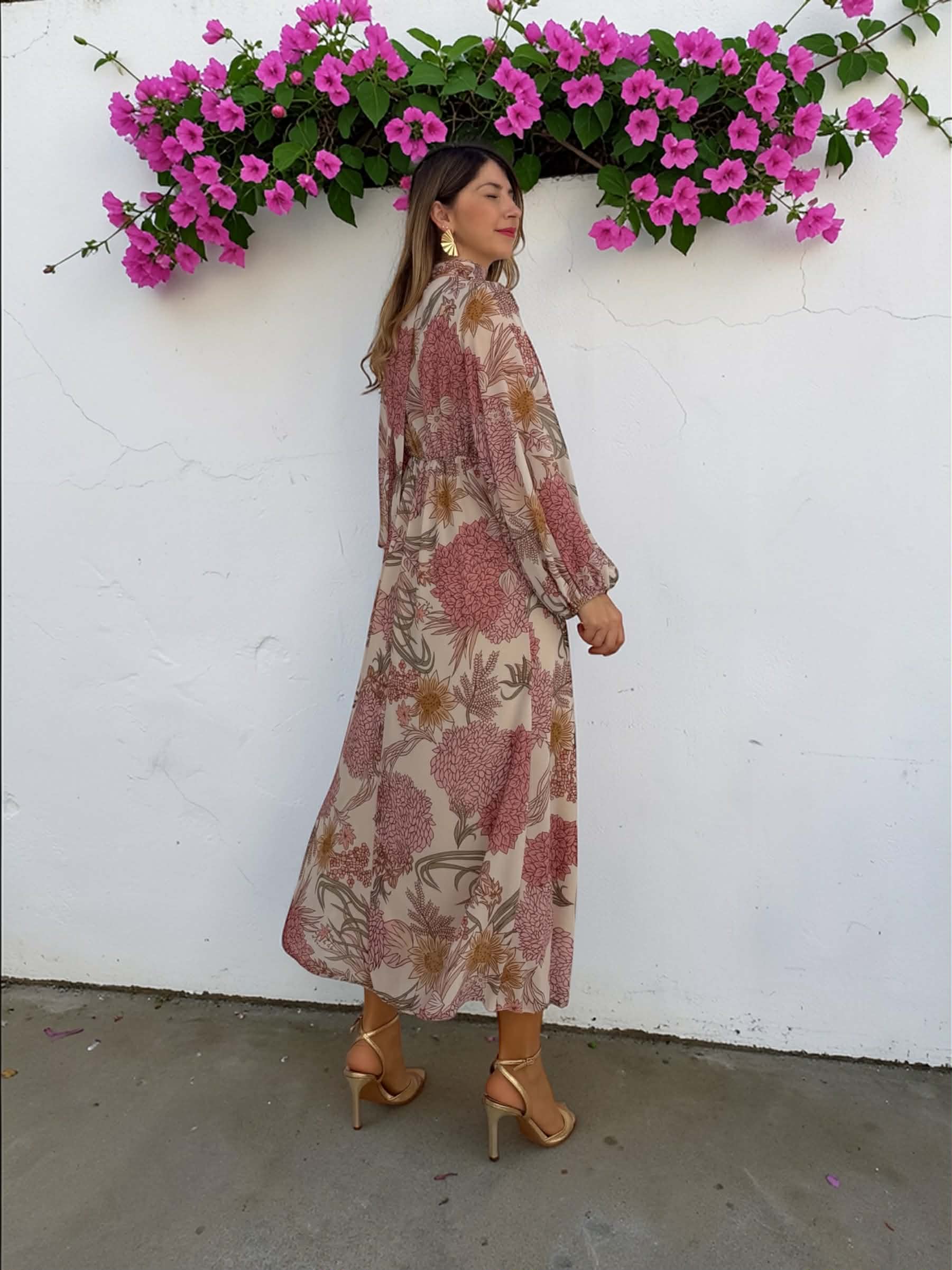 Vestido midi floral de gasa en tonos rosa, verde, beige… con manga larga, escote en V y goma en la cintura. Incluye forro interior.