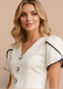 Vestido midi blanco brocado con escote en pico, detalle de botones en negro y manga corta con filo en negro. Abertura central delantera. Lleva forro interior y cremallera invisible trasera. Incluye hombreras.