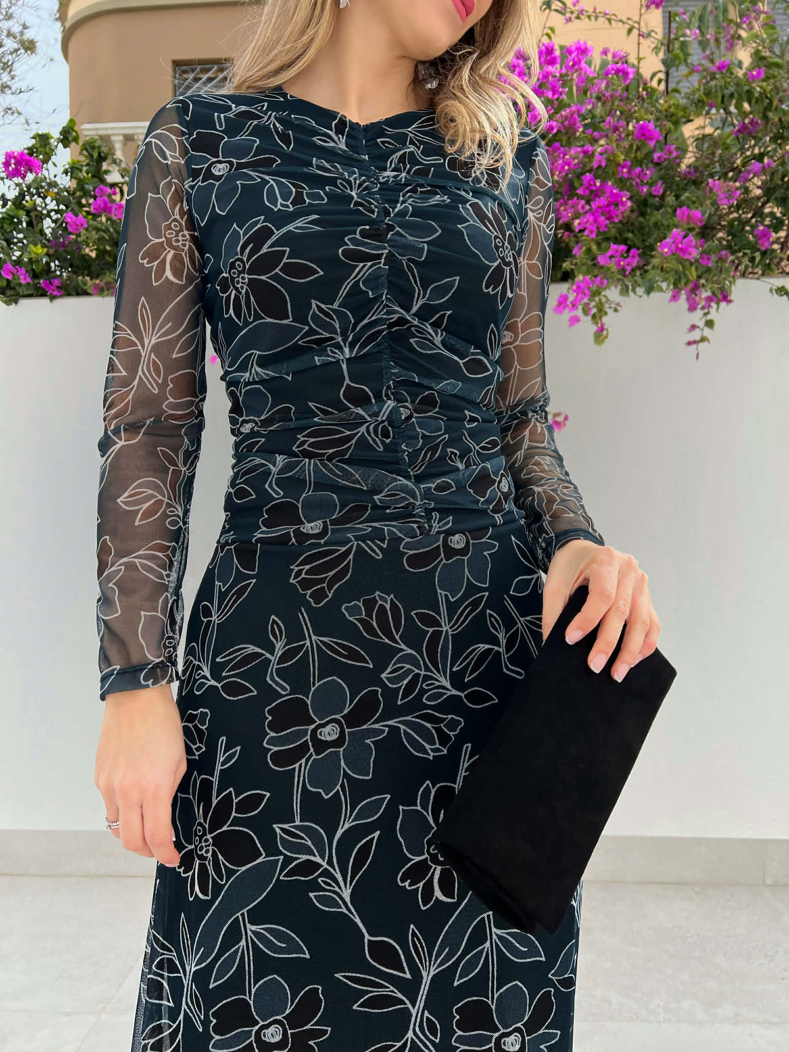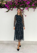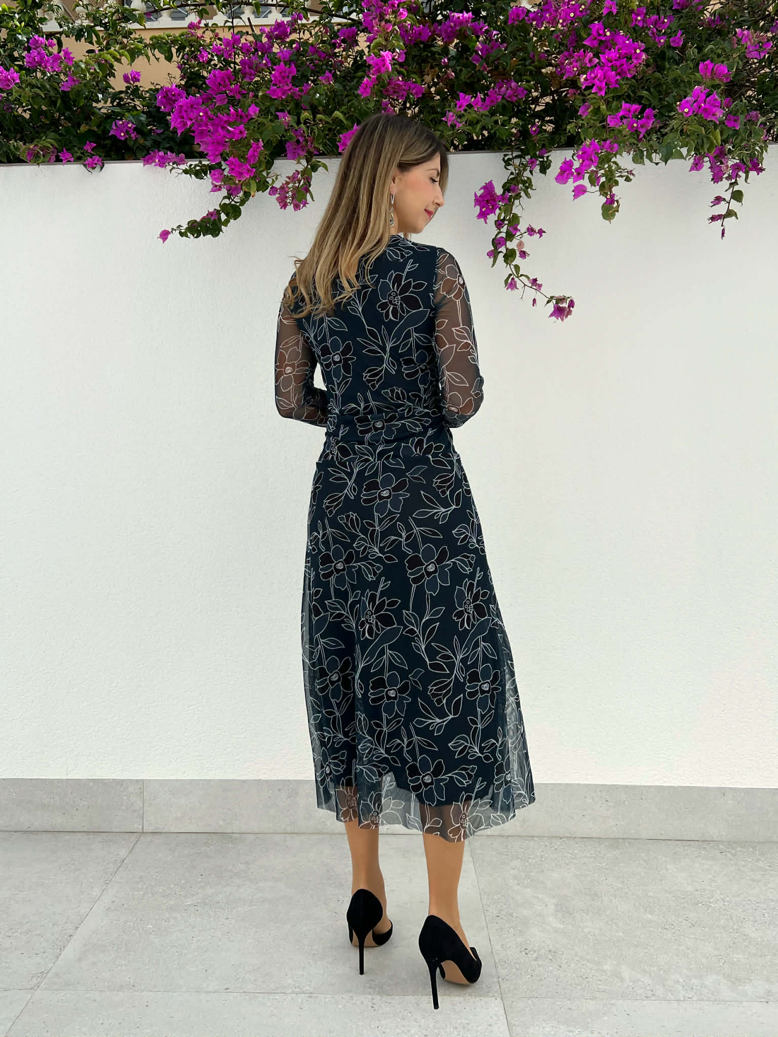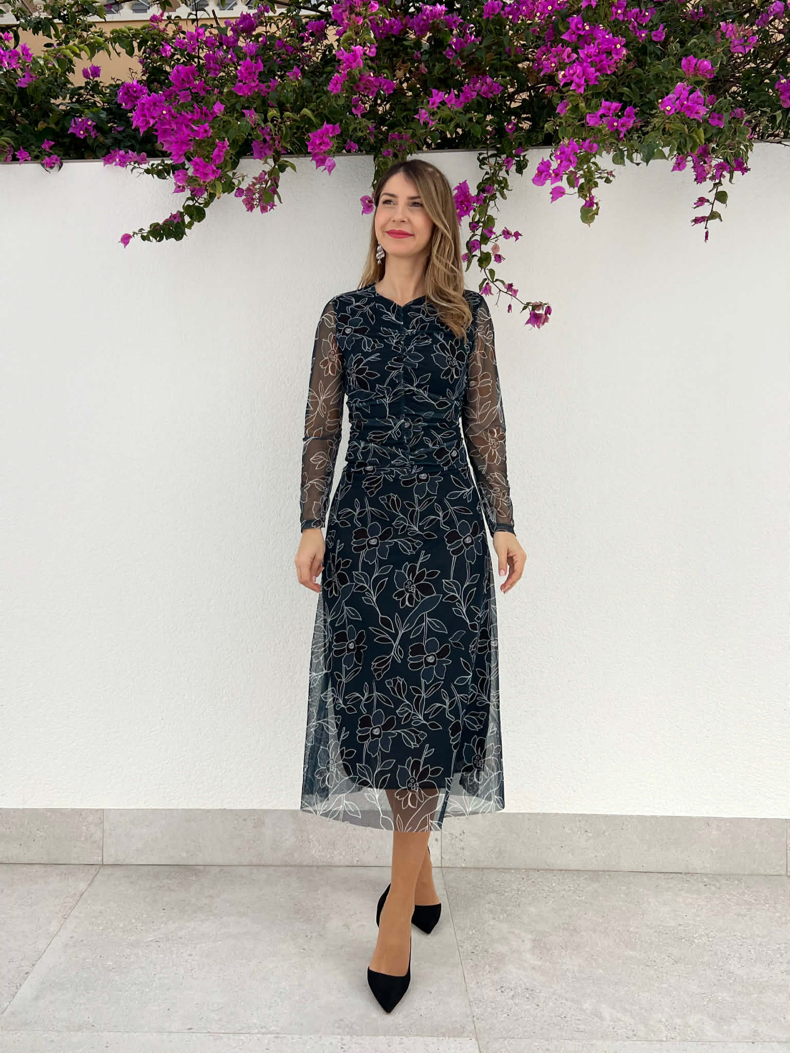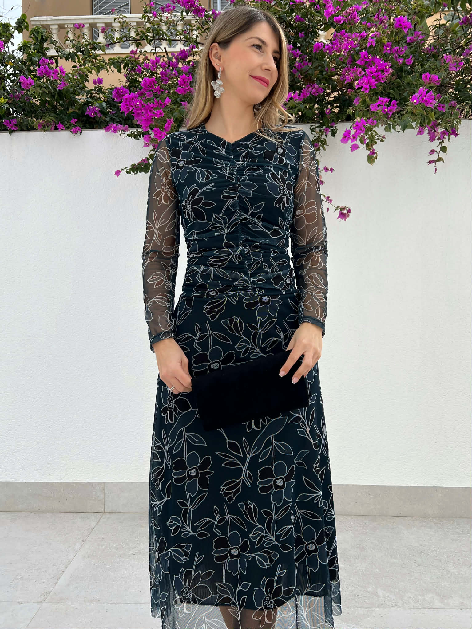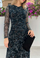 Vestido petróleo oscuro de invitada con flores color petróleo,negro y blanco. Tejido de tul con forro y mangas semi transparentes. Lleva fruncido frontal que disimula y estiliza. Y corte cadera con vuelo. Perfecto para bautizo, comunión, boda de día… Es un modelo cómodo y versátil, para usar después con esparteñas. Combina con negro, dorado, petróleo oscuro..